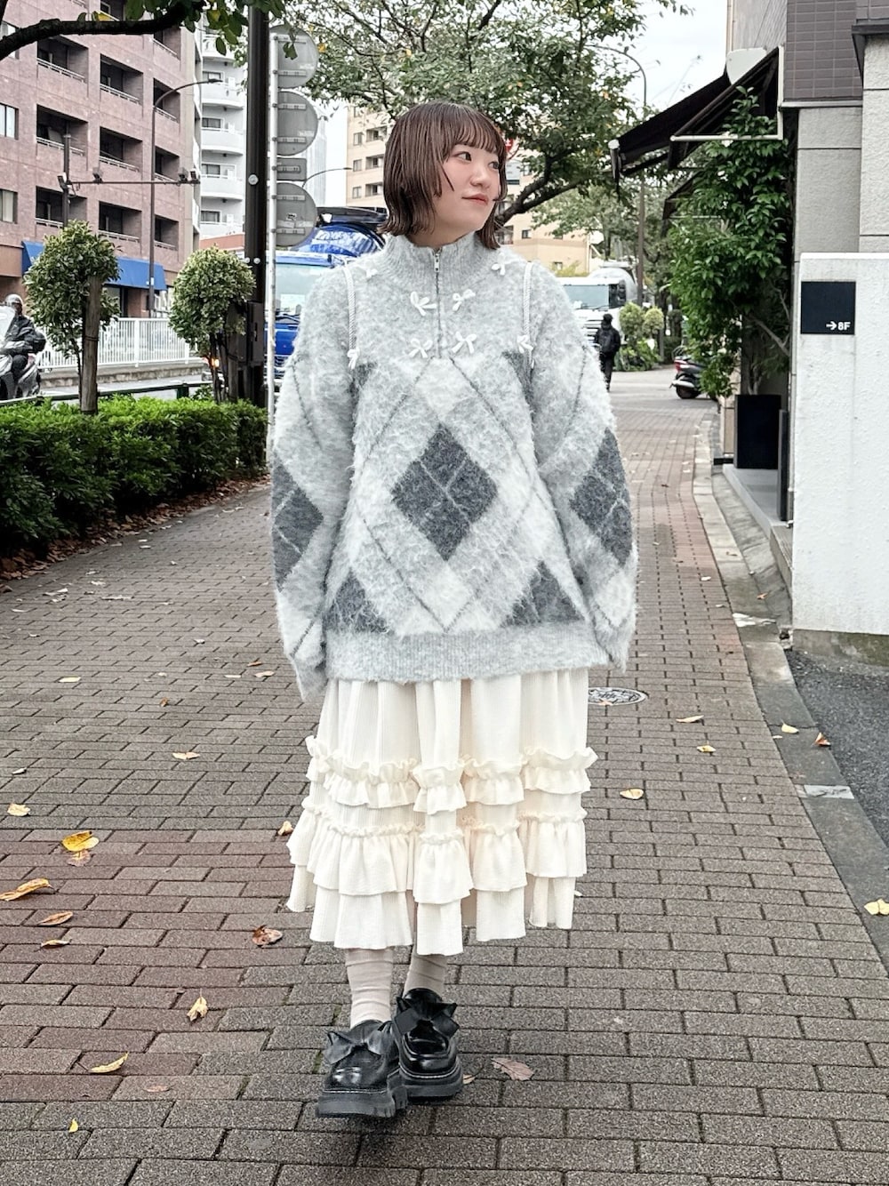 もちもちのアーガイルニットはトレンドを取り入れられるアイテムです♡ カジュアルなアイテムですが淡いカラーと首元のリボンでガーリーさをプラス! スカートはシンプルなデザインで普段使いしやすいアイテム! コーデュロイ生地なので寒い日にぴったり♡ ミディ丈なので低身長さんにもオススメです! ミルフィーユのように生地が重なったミニリュック。 前側にはファスナーがあり、小さいものを収納できます! 大きなリボンがポイントのローファー! 厚底なのでスタイルアップも叶えてくれます♡ また普段使いしやすいアイテムです。