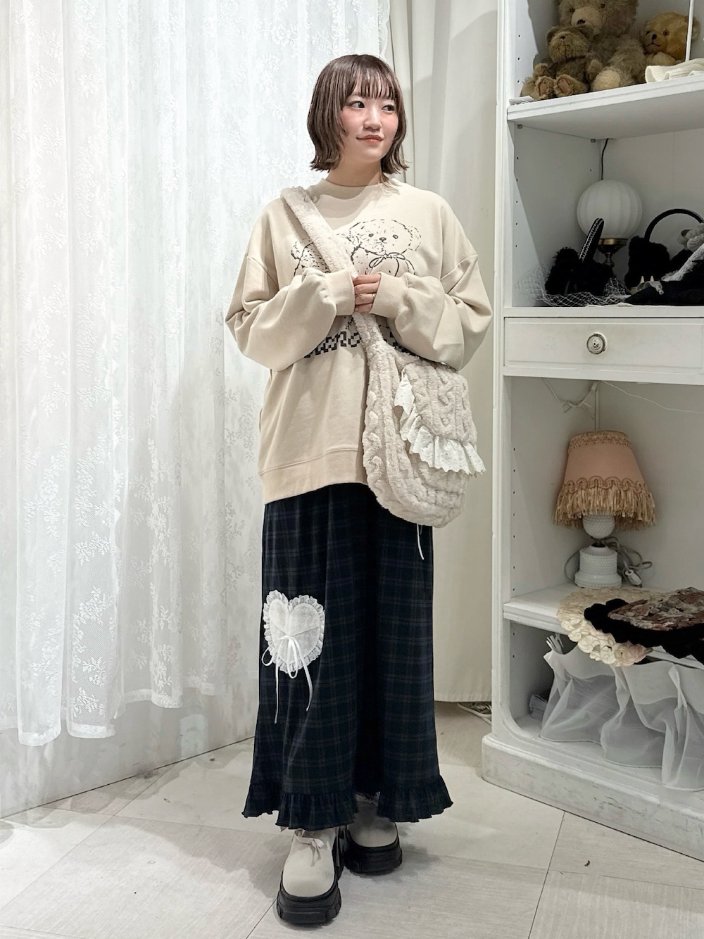 スウェットはくまさんのプリントがポイント! ゆったりとしたサイズ感でレイヤードもしやすいアイテム。 ヒップが隠れる丈感なのですっきりとしたシルエットのスカートに合わせるのもおすすめです! レースのハート部分は封筒をイメージしたスカート♡ 実際にポケットとして使用できます! ストレッチ生地なので動きやすく履き心地も◎ 秋冬にぴったりなふわふわなケーブル編み柄のバッグ♡ 外側には大きなフラップポケットがついており、内側にも広いポケットがあるので機能性も◎ ブーツはニット素材で柔らかく履き心地◎ リボンを編み込んだデザインがポイントです! 厚底なのでスタイルアップ効果も◎