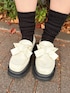 もちもちのアーガイルニットはトレンドを取り入れられるアイテムです♡ カジュアルなアイテムですが淡いカラーと首元のリボンでガーリーさをプラス! ドット柄のプリーツスカートは、トレンド感のあるアイテム! ウエストは後ろゴムなのでトップスをインするスタイリングもおすすめ! 大きなリボンがポイントのローファー! 厚底なのでスタイルアップも叶えてくれます♡ また普段使いしやすいアイテムです。