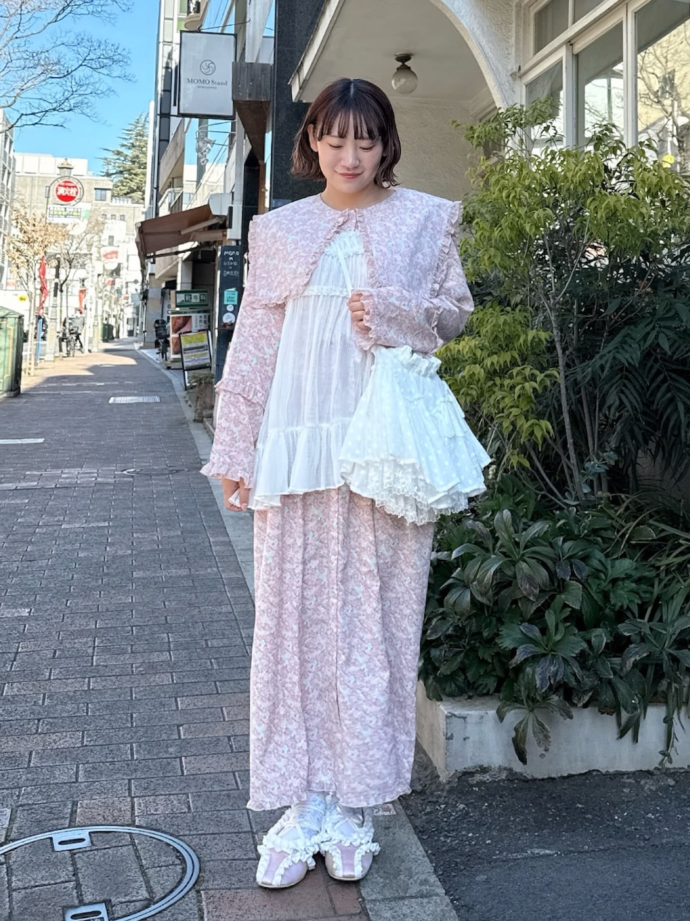 大きな襟がポイントの花柄ワンピース♡ すっきりとしたシルエットなので大人っぽく着用できます。 シアーチュニックはいつものコーデにレイヤードすればお洒落見え♡ チュニック丈なので体型カバーも◎ たっぷりのギャザーにリボンとローズモチーフがポイント! バッグは3種類のレースを重ねたとっておきのアイテム♡ サイドのリボンで長さ調節が可能です! 入口部分はゴムになっているので見た目だけでなく使いやすさも◎ フリルがたっぷりついたバレエシューズは足元まで華やかにしてくれます♡ 甲部分はゴム仕様なので着脱しやすく履き心地も◎