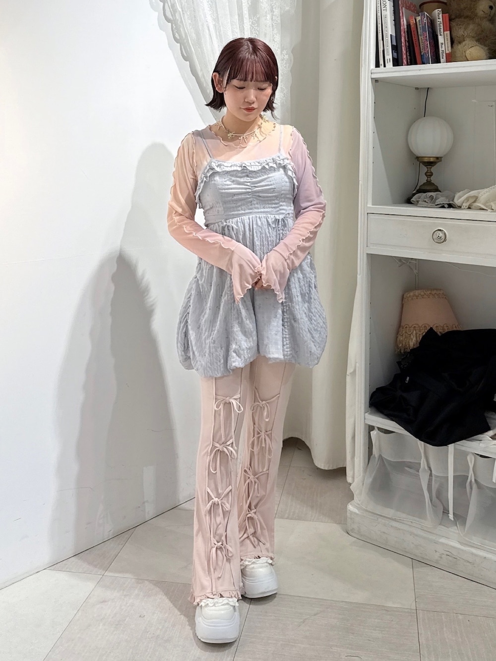 オリジナルの花柄をプリントしたミニワンピース! アジャスターで簡単にウエスト位置を調節でき、 裾はドロストで長さを変えられるので身長、骨格問わず着用出来ます! 畳んでもシワが気になりにくい素材なので旅行にもおすすめ♡ シアートップスはいつものコーデにプラスするだけでおしゃれ見え♡ デコルテが綺麗に見えるように首元はすっきりとしたデザインになっています! フレアパンツはストレッチの効いたリブ生地です! リボンがポイントでミニスカートとのレイヤードもおすすめ♡ シューズはフリルとボリュームのあるソールがポイント! スタイリングのアクセントにもなり、足の細見えが叶う1足です♡