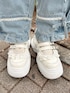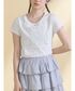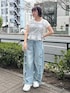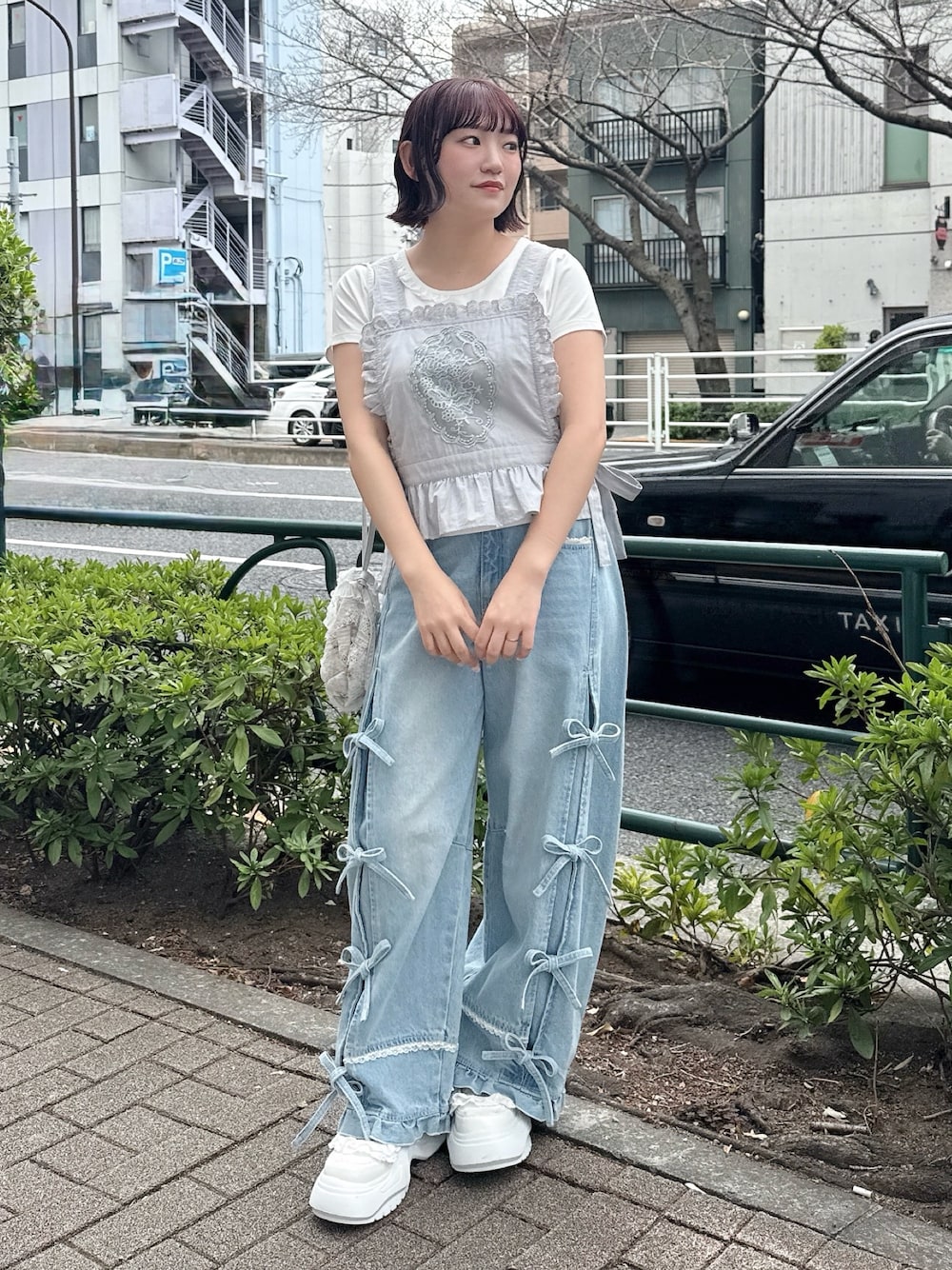 エプロンのようなビスチェはレースのアップリケがポイント! シンプルになりがちな夏のコーデを華やかにしてくれます♡ コンパクトなサイズのTシャツはレイヤードにおすすめ! すっきりとした印象にしてくれます。 トレンドのバレルレックデニムにレースやフリルがついて登場! ウエスト部分は脇がゴムになっているのでインした際も綺麗に見えます。 カジュアルなアイテムなのでトップスはガーリーなアイテムを合わせるのがオススメ! シューズはフリルのボリュームのあるソールがポイント♡ スタイリングのアクセントにもなり、足の細見えが叶う1足です!