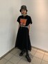 チュールのスカートを甘くなりすぎないように、ブラックのワントーンコーデに。 さらにバケットハット、Tシャツ、クリアベルトで合わせて、甘辛なミックスコーデに仕上げました!