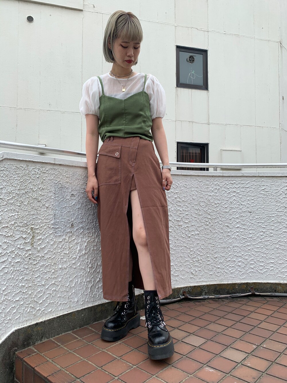 バックシルエットが特徴のビスチェと、透け感がありシャイニー素材のブラウスがセットになったトップス! ショートパンツに巻きスカートがくっ付いているデザインのボトムを合わせて、色味を少し秋っぽくしてみました。 今からの時期活躍間違いないアイテムです!