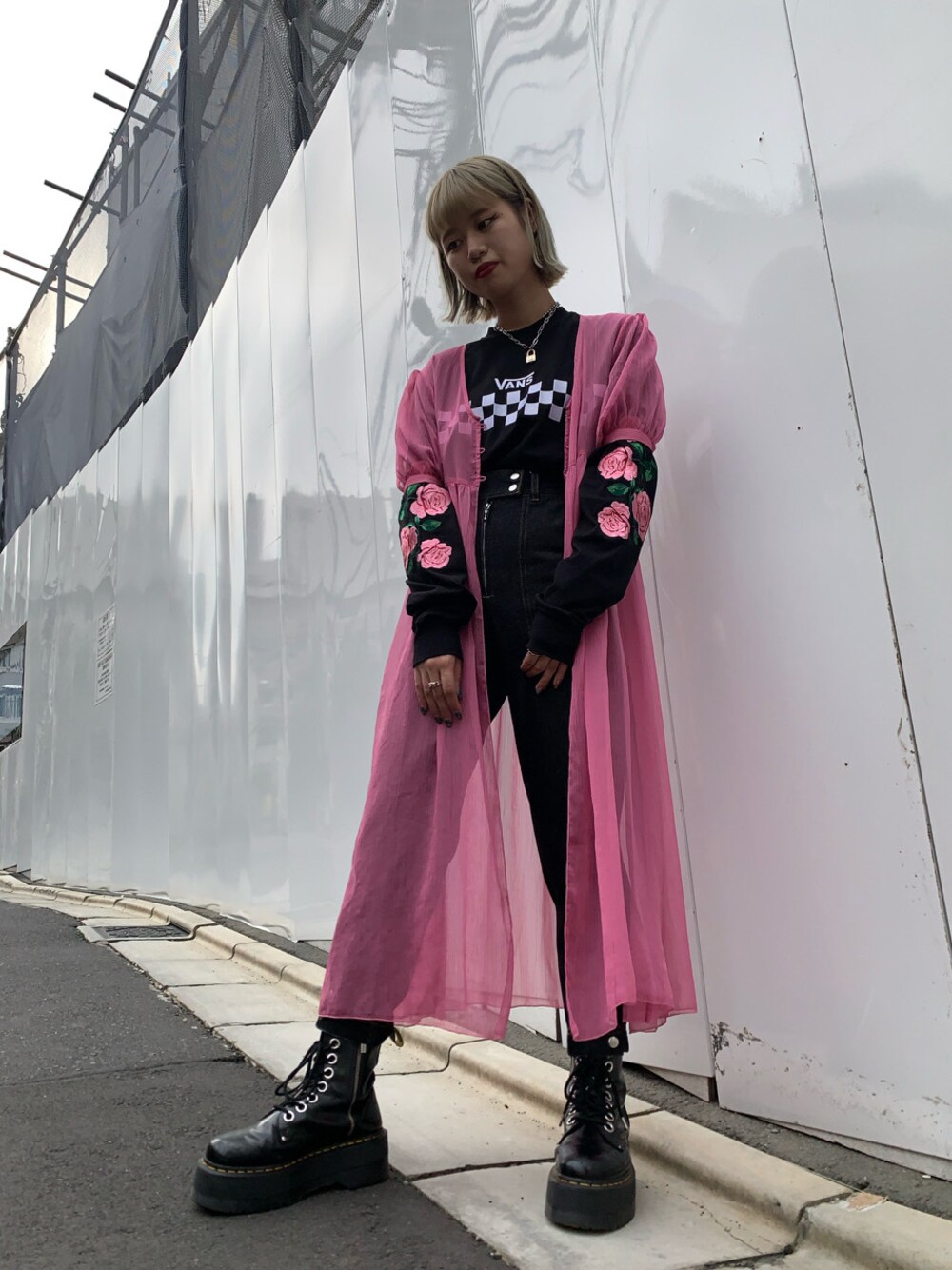 ストリートなコーディネートに、ピンクのシースルーワンピを合わせてミックススタイルにしてみました! VANSの別注アイテムは袖の刺繍がポイント!
