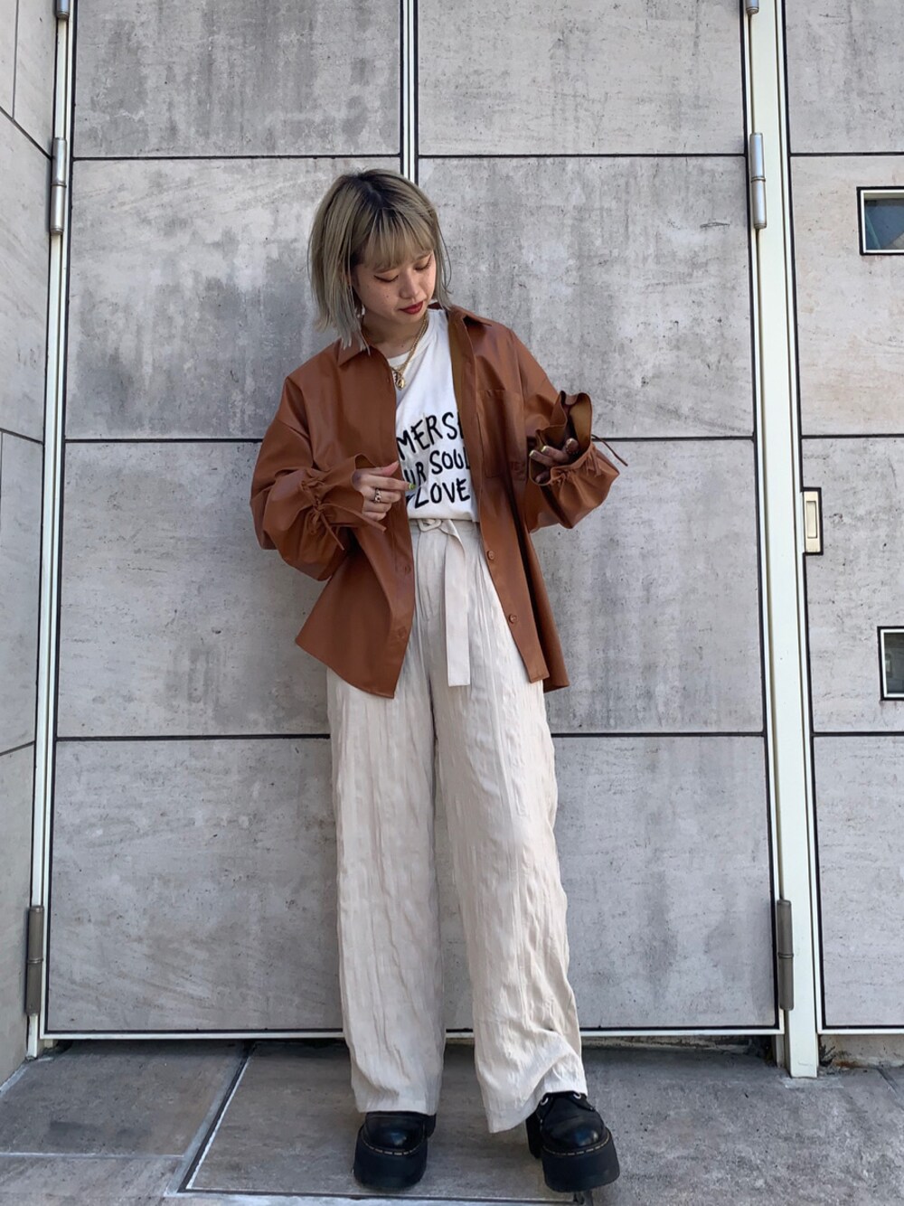 同じ色味のワントーンコーディネート✔️ 羽織りに今季イチ押しのエコレザーでブラウンの色味を持ってくることで、コーディネートにメリハリをつけました!