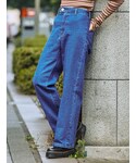 ハイウエストなデニムを主役に、シャツは前だけインがさらに脚長効果発揮! コンパクトに折り畳めるエコバッグをポイントに✨