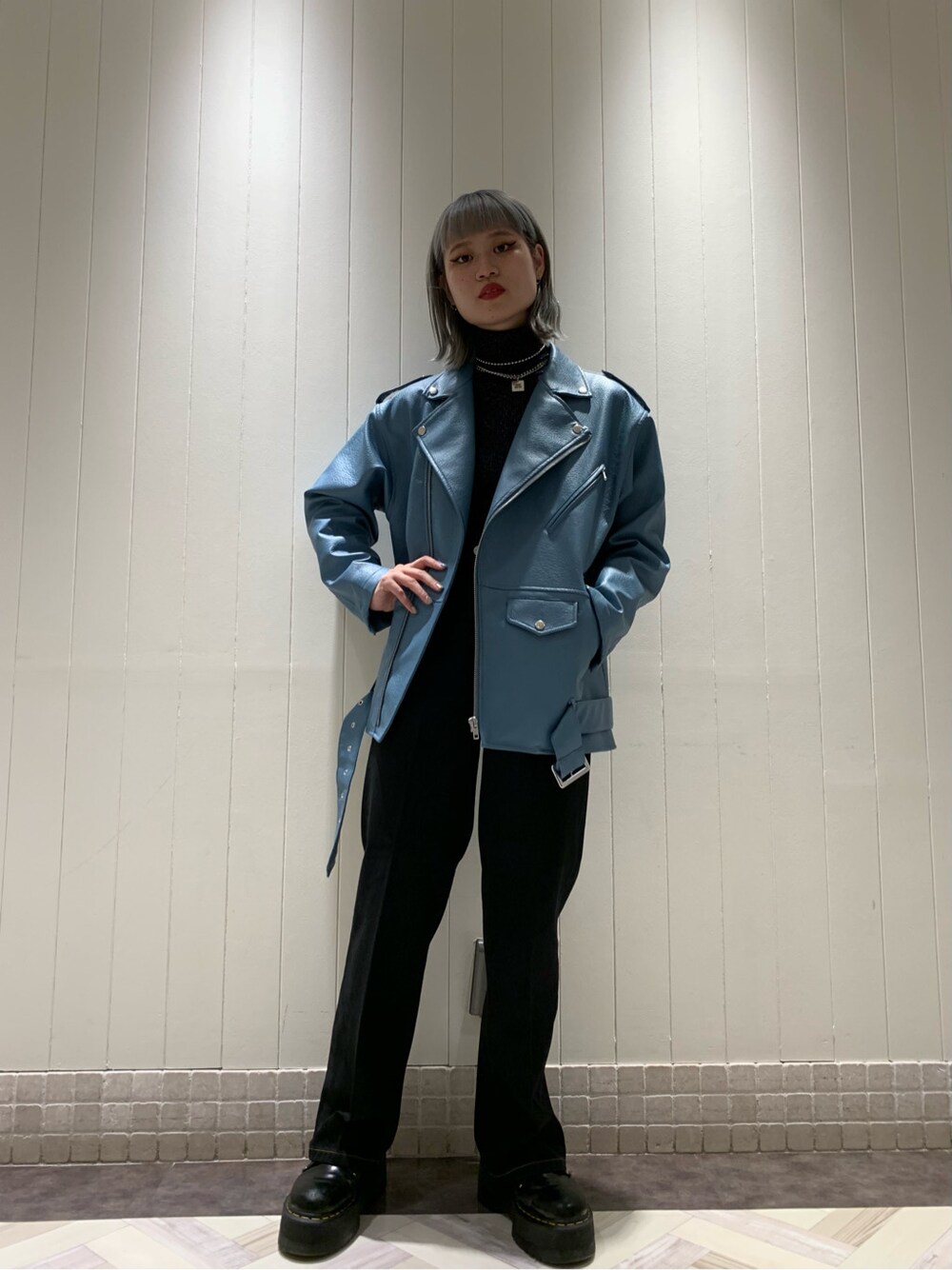 オーバーシルエットなライダースジャケット✨ オールブラックに鮮やかなブルーが映えるコーデ! レザーが柔らかいので、袖は裏地見せがおすすめ!