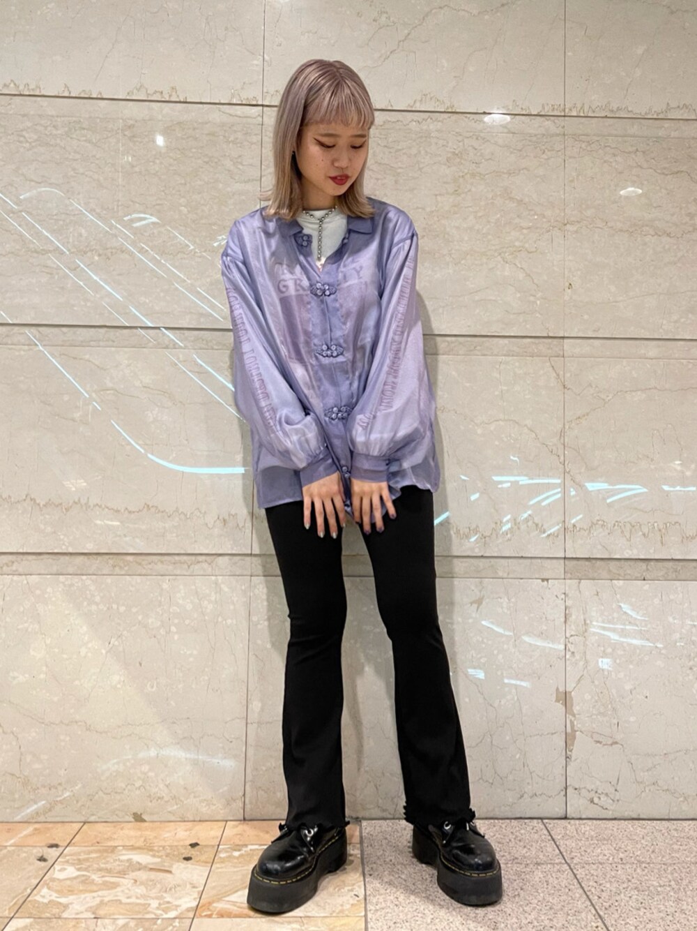 トレンドのチャイナディティールのシャツも春らしく、シースルー素材で登場! 春はロンTを重ね、夏はキャミソールを重ね、長い季節活躍するアイテムです! シャツなので、羽織りとして使うのも◎ 細身のフレアパンツでキレイめコーデにしました! ロンTのグランジテイストに合わせて、ダメージデニムとブーツで、全体的にグランジテイストでまとめたコーデもオススメです!