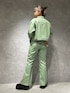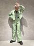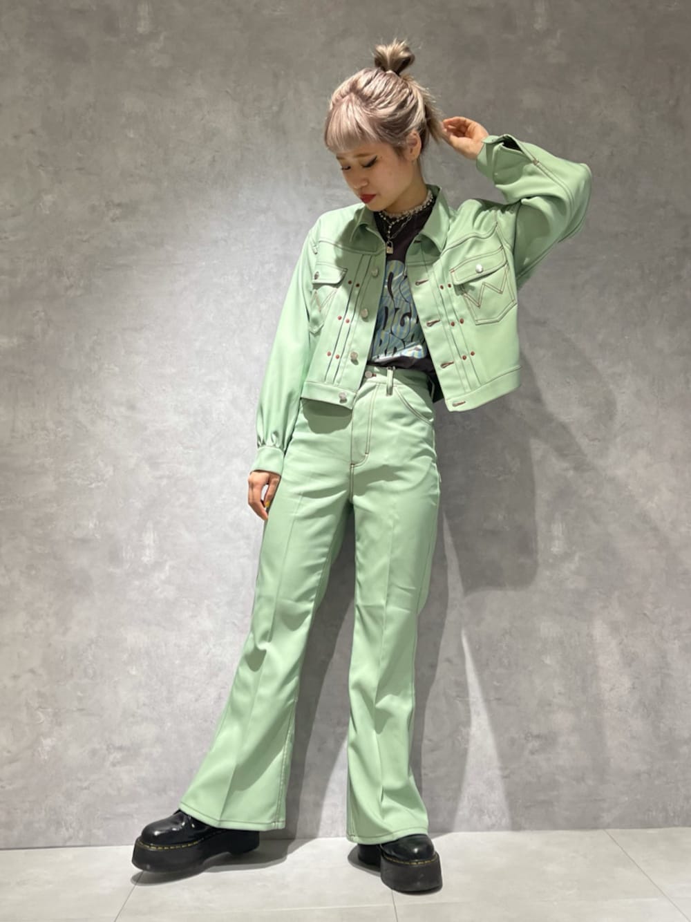 jouetieとWranjlerのコラボアイテム。 このカラー使いはjouetieならでは、そして素材はWranglerならではのランチャー素材といったストレッチ性のある素材がポイント! キャッチーな色味ですが、ブラウンのステッチで大人っぽさを演出。 ジャケットの裾はベルトで調節ができ、見せたいシルエットに変化出来ます! パンツは綺麗にフレアに広がり、脚長交換抜群です! セットアップが明るい色味に対して、締め色のブラックをインナーに合わせました。 ビッグTシャツよりもコンパクトサイズのTシャツがバランスの良いコーデにまとまります。 オールシーズン着回しができるセットアップはマストバイアイテムです!