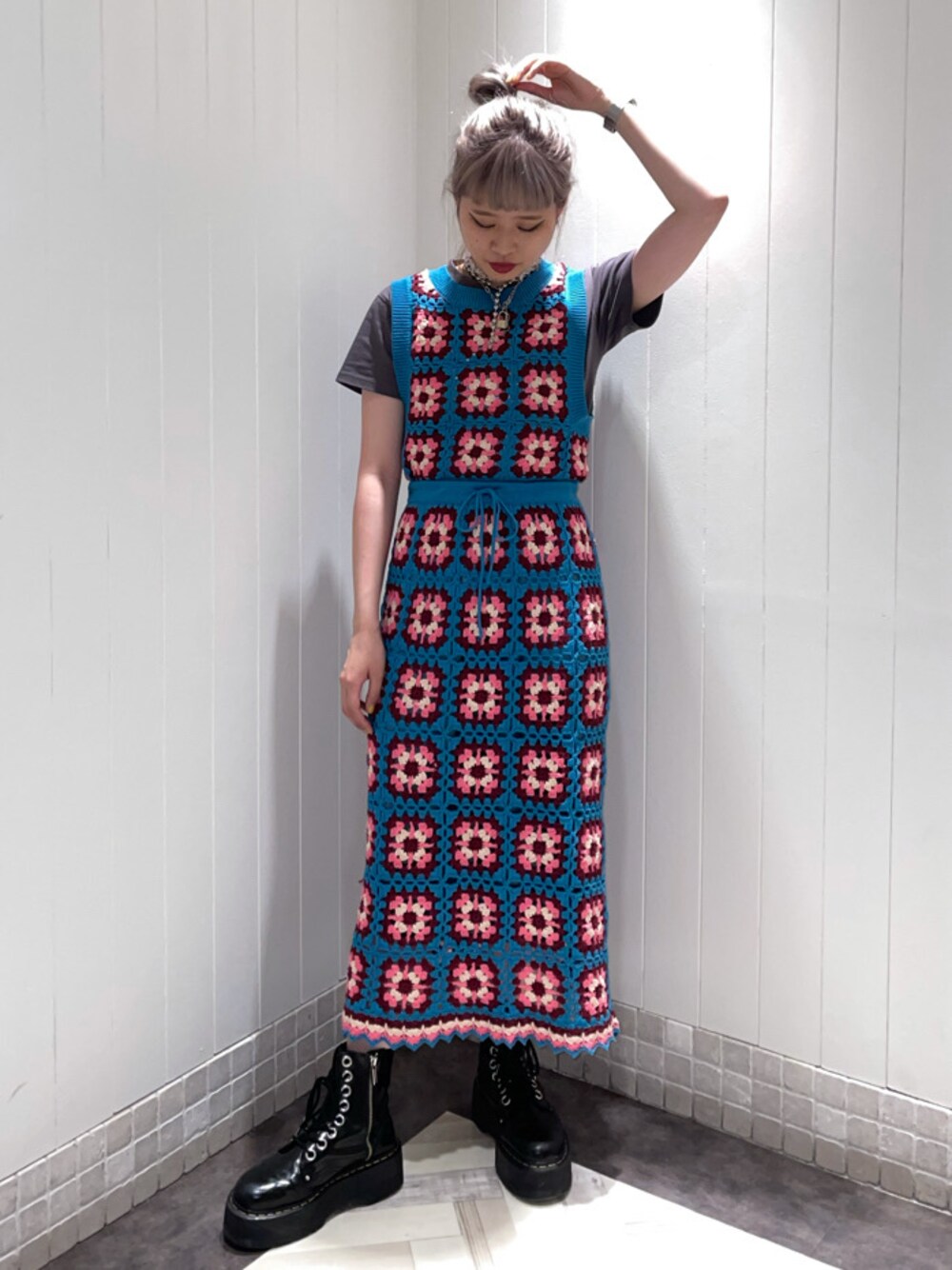 jouetieならではのカラーで編まれたクロシェセットアップ。 コンパクトなサイズ感で、上下揃えるだけでお洒落なセットアップです。 ベストはインナー見せができるので、私は同じサイズ感のTシャツと合わせてバランスの良くまとめたコーディネートにしました! 真夏にはブラトップや、キャミソールに変え、肌見せも◎ スカートには同系色の取り外せるインナーが付いているので、安心して使えます! インナーの代わりにデニムやショートパンツとの合わせもオススメです! 見た目はタイトですが、ニットの伸縮性もあって着心地、肌触りは抜群です!
