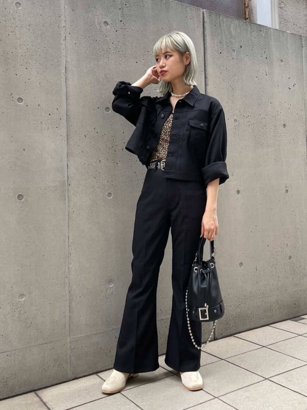 オールブラックのセットアップを自分らしくそして、今季トレンドのウエスタンブーツ、ヒョウ柄を合わせ、一癖あるコーデにしました! ハイウエストのフレアパンツはこのジャケットの様なジャスト丈のトップスと相性良く、またトップスをボトムインがマストでオススメです! ジャケットはウエストラインの長さなので、ロング丈ワンピースとの組み合わせも◎ まだ夏ですが、コーディネートのどこかに秋物をプラスしたい方は足元(ブーツ)、小物から取り入れると、この時期からでも簡単でチャレンジしやすいです!