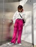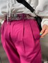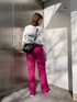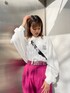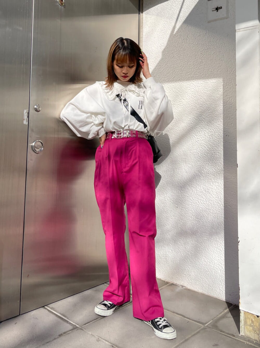 カラーパンツのカジュアルコーデ 【トップス】同色の付け襟が付いたトレーナー。オーバーシルエットでメンズライクですが、フリルの付け襟が女性らしさをプラスしてくれます。 【ボトムス】161cmでかかとくらいの長さで丈感長めのパンツ。ハイウエストでストレートなので脚長効果抜群です!ウエストもタックが入っているので、トップスインしても◎ 【バッグ】コンパクト目なレザーバッグは、jouetieならではなライダースディティールがポイントです!コーディネートのアクセントにも!
