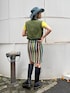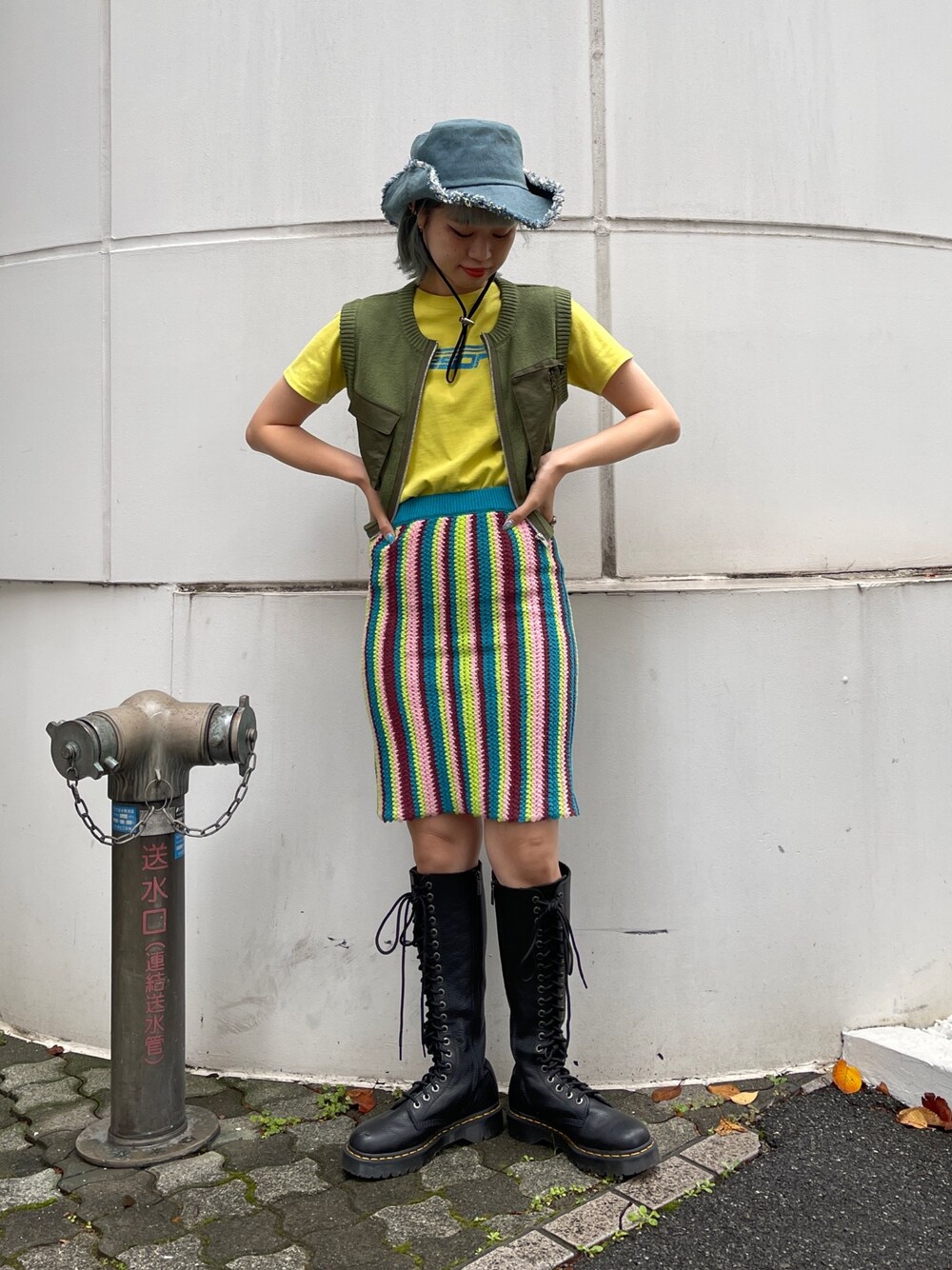 夏のミリタリー×カジュアルコーデ【トップス】胸元のラメロゴがキャッチーで可愛い!コンパクト目なサイズ感なのでインナーとしても大活躍!【ベスト】コンパクトサイズなミリタリーベスト。ニット素材なのでカジュアルに!【スカート】ニット素材がサマーニットなので真夏でも着られます!