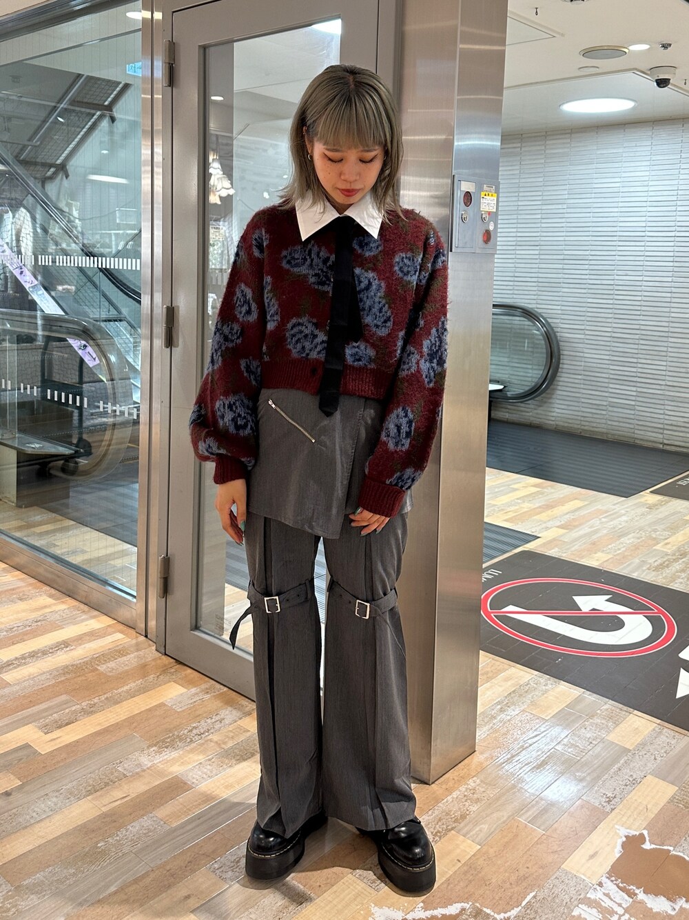 大人キレイめカジュアルコーデ【カーディガン】肌触りが柔らかい素材です!肌にあたってもニット特有のかゆみはありません!バラデザインが可愛らしくもボルドーの色味で大人っぽく挑戦出来ます!【パンツ】巻きスカートとフレアパンツのセットアイテム!今季っぽいトレンドデザインが目を引くアイテムです!161cmで厚底合わせがより脚長効果でオススメ!