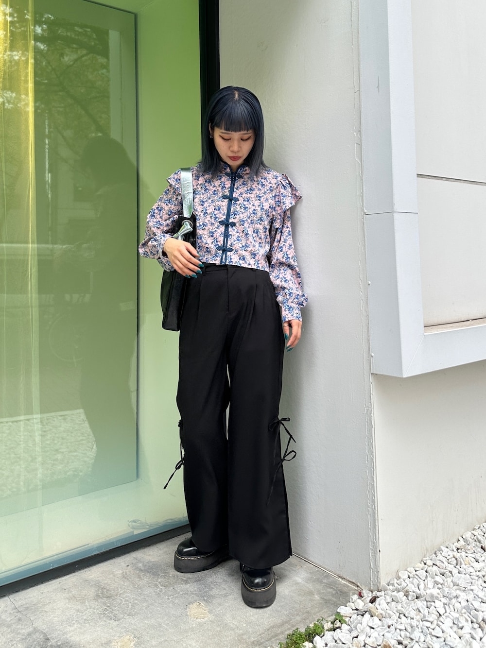 大人カジュアルコーデ【シャツ】総柄でチャイナボタンがポイント!なシャツは、ハイウエストボトムとの相性が抜群です!薄手のサラッとした生地感で速乾性も◎【バッグ】今季注目なメタリックバッグ!A4サイズがすっぽりと収まり、ノートパソコンも入るサイズです!