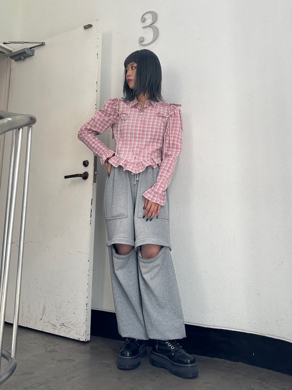 スポーティMIXコーデ【ブラウス】肩開きで抜け感が出せるブラウス!華奢見えするデザインが◎【パンツ】2wayレングスパンツも気分に合わせて変えらるところがポイント!低身長の方にももってこいなドローコードもあり、シルエット変化が楽しめます!
