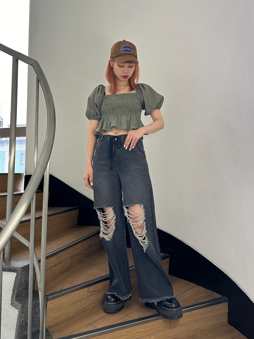 ストリートMIXコーデ【ブラウス】体のラインを綺麗に、華奢に見せてくれるブラウス♡胴回りのシャーリングは柔らかく、締めつけが気になりません!【デニム】ハイウエスト、ローライズの中間のミッドライズデニム!脚長効果抜群なデニムなので、いろんなトップスとの相性が◎