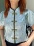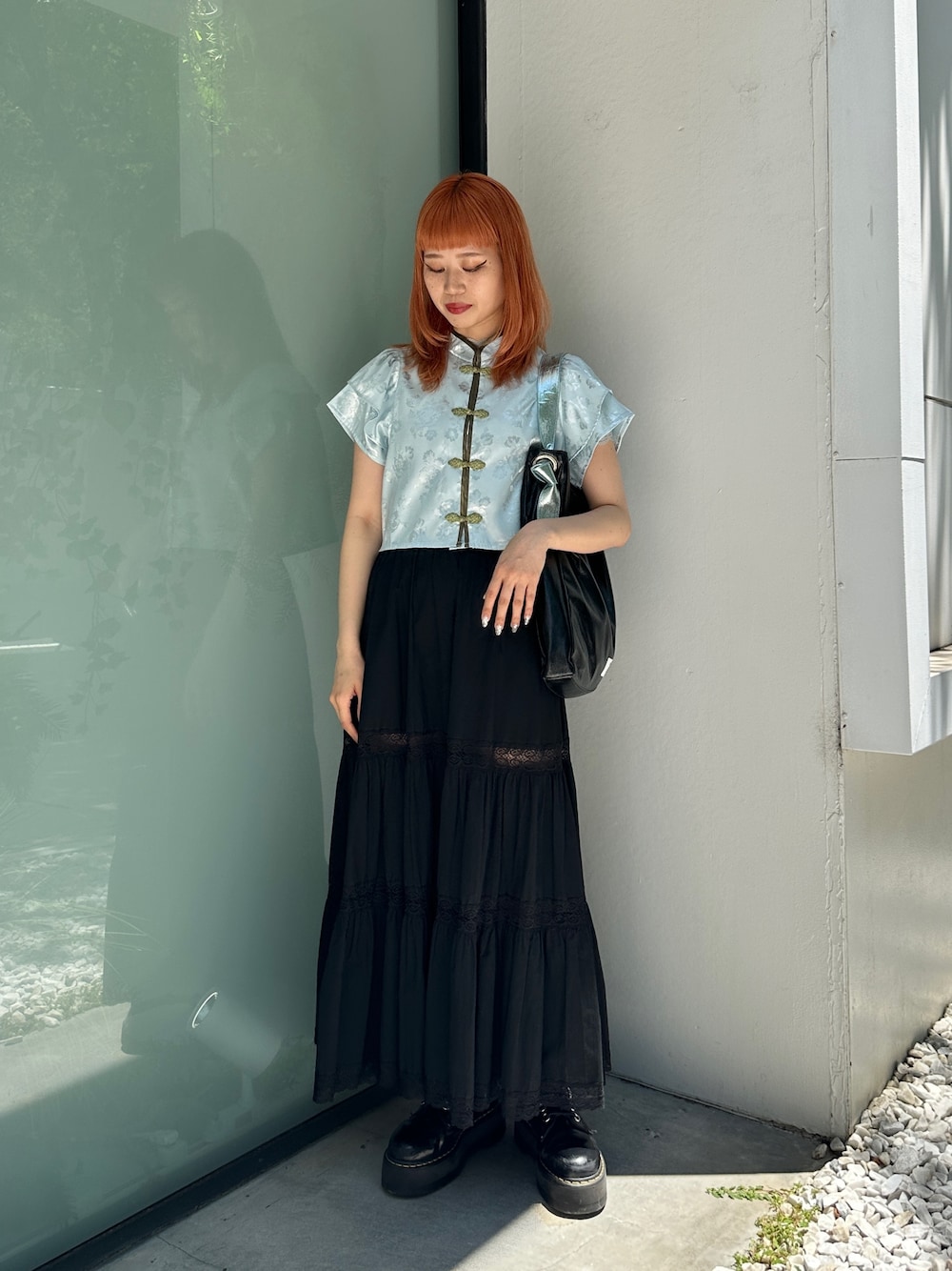 綺麗めチャイナコーデ【ブラウス】さらっとした着心地のチャイナブラウスはコーデを華やかにしてくれるアイテム!肩周りのフリルが肩、二の腕を細見えに!【スカート】レースデザインが抜け感を演出してくれます!161cmで足首くらいの丈感です。脚長効果も抜群!