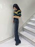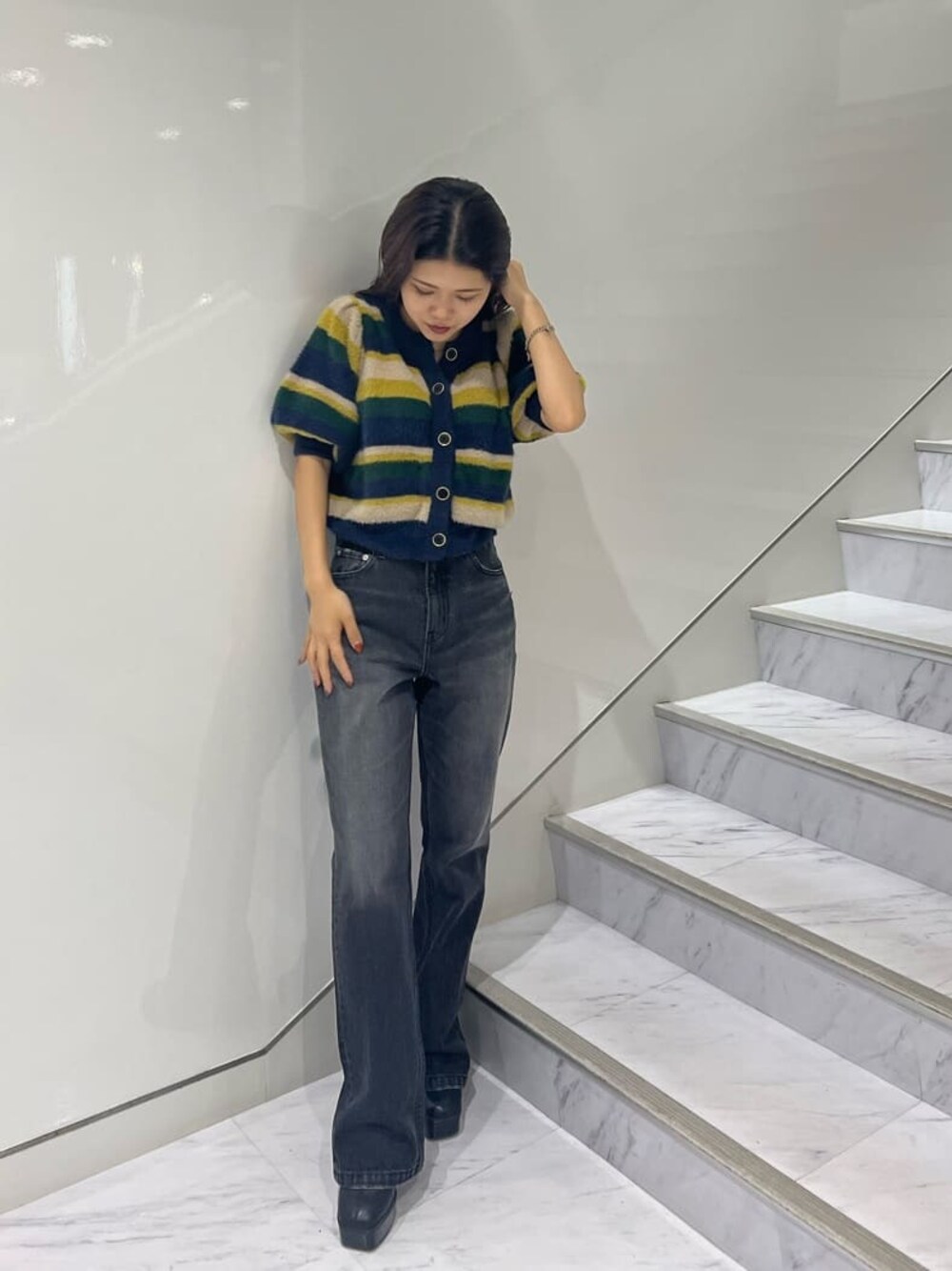 【秋の私服コーデ❤︎】【tops】マルチボーダーの配色がEVRISらしさ全開!!フワフワで肌触りも良くて着心地も抜群ニット❤︎前のボタンは開閉できるので全部開けてカーディガンとしても着用できます。【bottom】ウォッシュ加工が効いていて珍しいグレーデニム!バックデザインもワンポイントで、裾にはスリットが入っているので足元がチラッと見えます。153cmで10cmヒールで2〜3cm余る程度になります。【shoes】22.5cmでSサイズ着用。