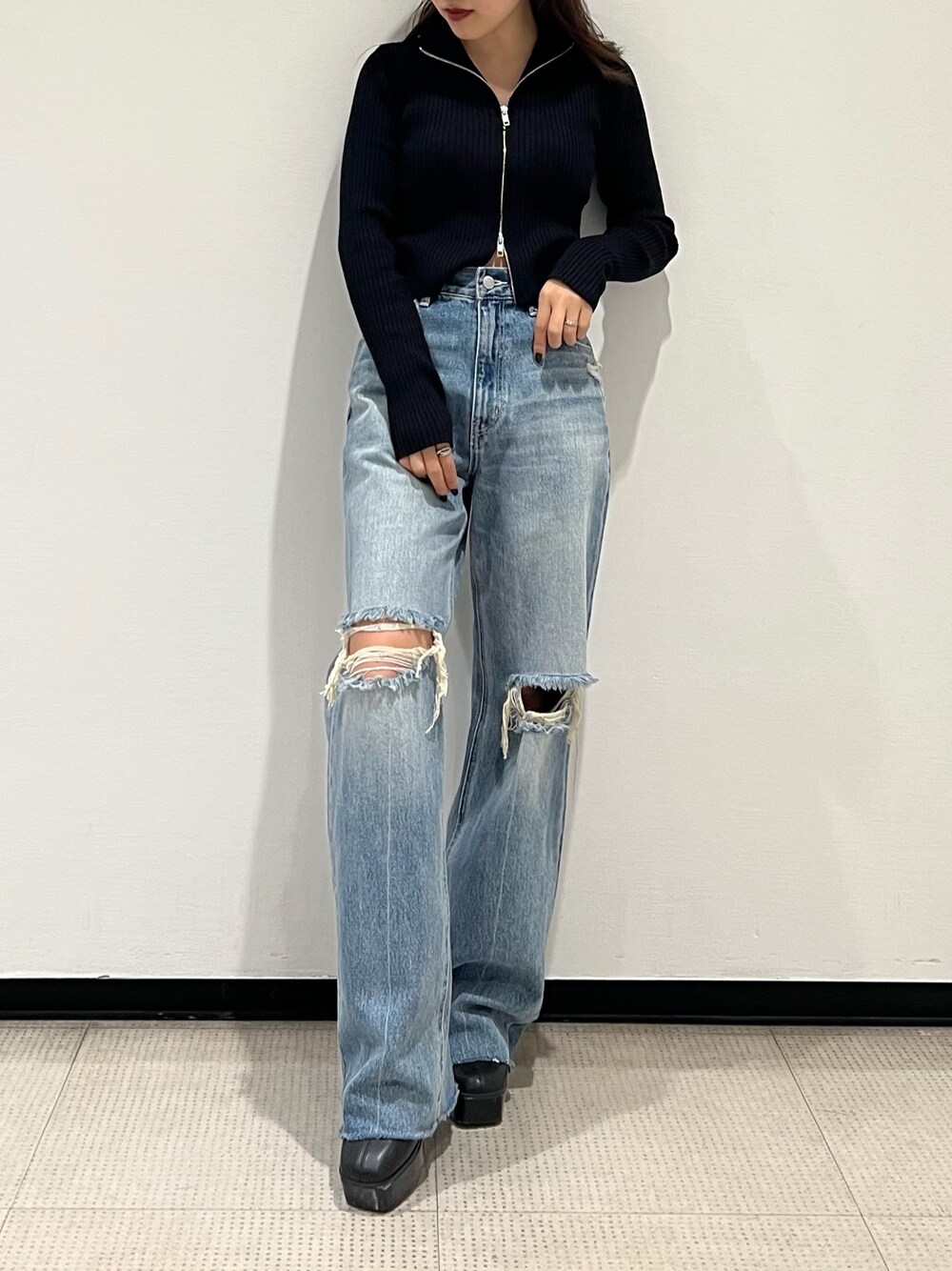 【トレンド詰め込んだ大人コーデ❤︎】【tops】上下開閉可能なジップニット❤︎リブ素材で細見え効果大!!ショート丈なのでボトムにインしないで丁度良いスッキリした丈感です。【bottom】程よい開き具合のダメージデニム❤︎ワイドシルエットで、ゆるっと履くのがオススメ♪身長153cmの私で7cmの厚底合わせで引きづらない丈感です!【shoes】22.5cmで Sサイズ着用。