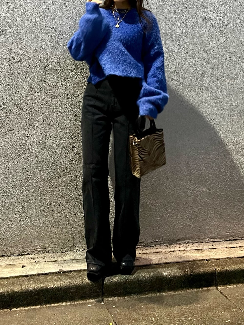 映えるブルーニット💙【tops】柔らかくて着心地の良いニットトップス!!ショート丈なのでインせず丁度良く着用できます❤︎【bottom】センタープレス入りでシルエット綺麗なデニム!153cmでも7cm程のヒール合わせで着用可能です。【bag】コーディネートのポイントにゼブラ柄をチョイス♪