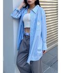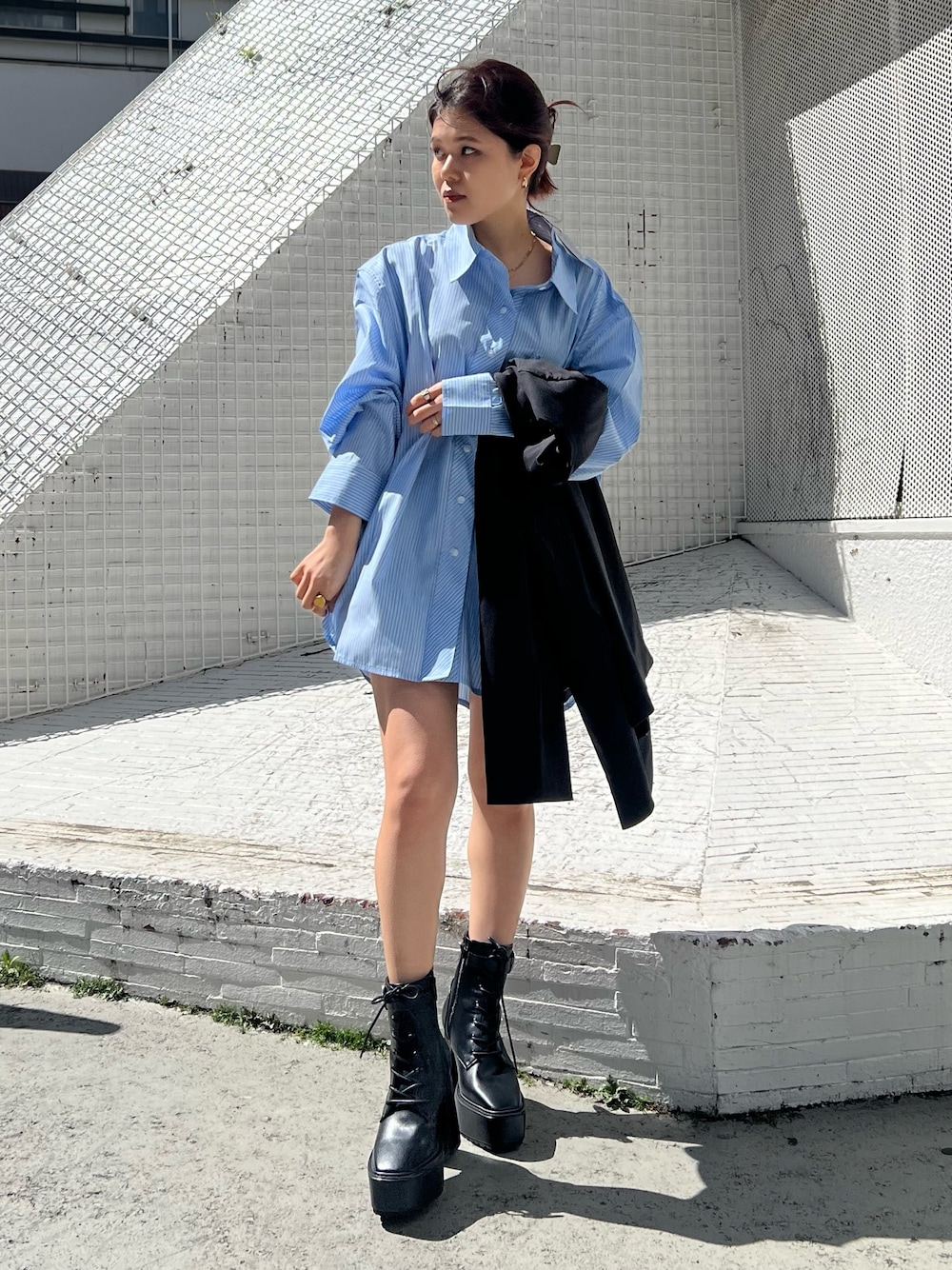 定番の大人気コーデ🩵👔【shirt】店頭でも大人気のストライプシャツ!!左胸元にサニーモチーフのロゴデザインが施されています🌞💕サラッとした素材感なので春から夏にかけて活躍間違えなし!【jacket】オーバーサイズで153cmでお尻すっぽり隠れる丈感!【shoes】22.5cmでSサイズ着用。