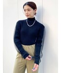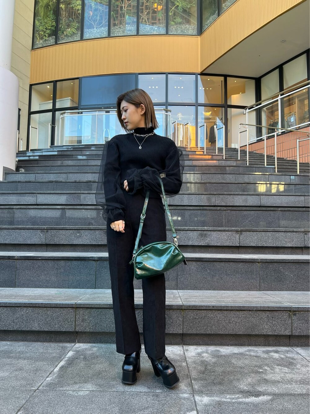 【上品なオールブラックコーデ】 袖部分のチュールがポイントのニットで、1枚で上品な印象になります!BLACKだとさらに大人っぽさも増しますね!!縦リブになっていて細身なので、ウエストもキュッとして綺麗に見せてくれます!!合わせはアンクル丈のフレアパンツで合わせてみました!Sサイズ着用。細身になっていて、ピンタックの線も入っているので、足が長くすらっと見えます!!外側はスウェード生地になっていて冬仕様になっています!152cmの私が履いて足首くらいの丈間ですが、短いヒールなどでも全然合わせられるくらいでした!今回は厚底と合わせてみました!今まで出たローファーに比べると、とっても軽く歩きやすいのでおすすめです!!私は23.5㎝でSサイズを履いています!是非参考にしてみてください!!