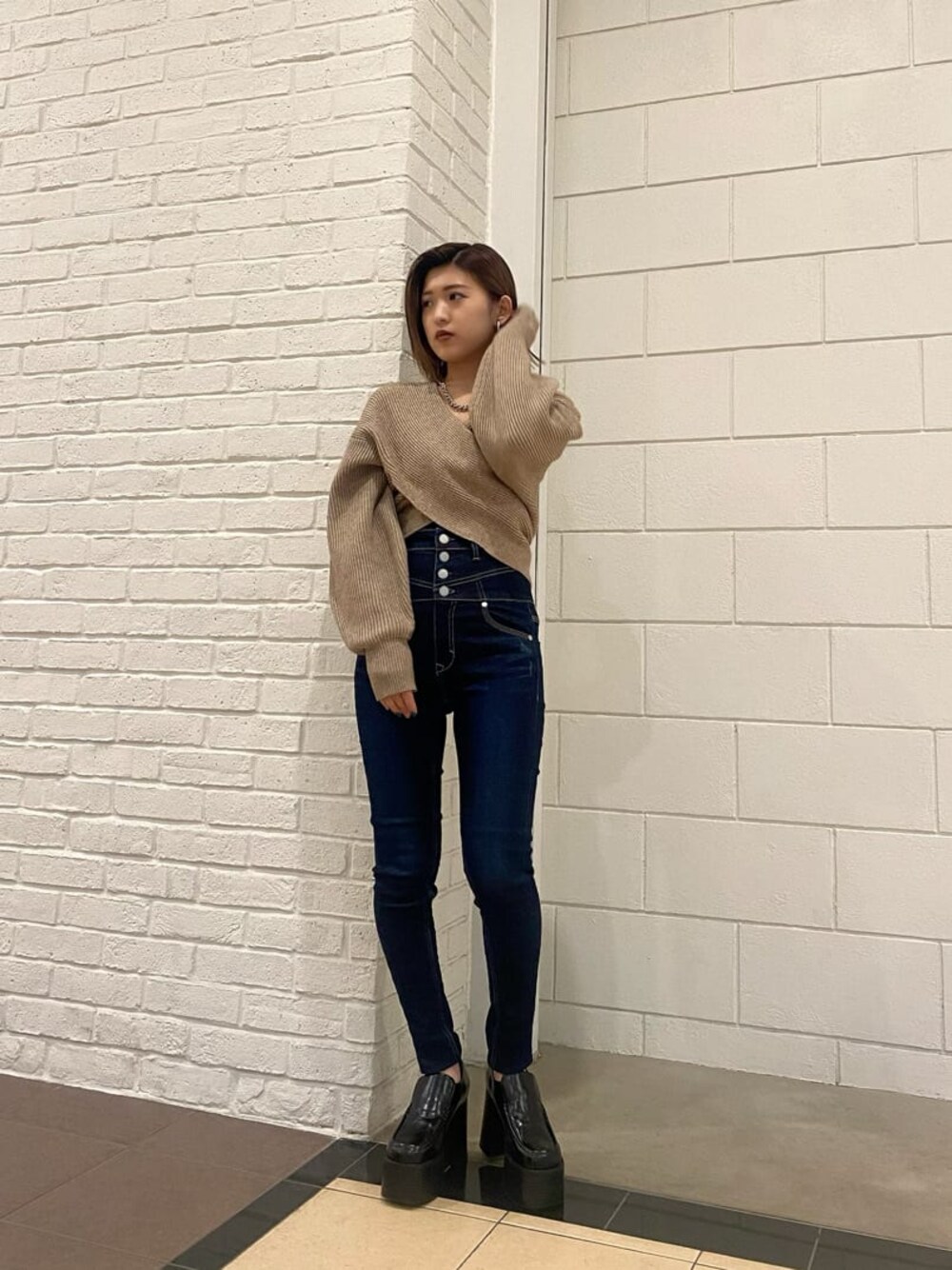 【トップス】クロスになっているデザインが目を引くアイテム。袖のボリューム感があることでウエストがキュッと細見え効果もあります! 合わせるボトムは細身なタイプがおすすめ!綺麗めな格好だったら、マーメイドスカートとか合わせても◎です! 【ボトム】さりげなくダメージ加工が入っていて一癖のあるスキニーです♪ウエスト部分の斜めのラインがウエストがシェイプされたように綺麗に見えますよ!柔らかさもあり履きやすいのでおすすめです!丈は152cmの私だと少し長くなったので、内折りにして調節しています! 【シューズ】EMODAで定番の厚底ローファー。シンプルですが、アッパー部分のステッチが目立って可愛いですよ!スキニーを履いた時の足首の部分もスッキリして見えるので細見え効果もあり、安定感も抜群なので歩きやすいです!!