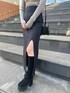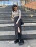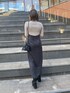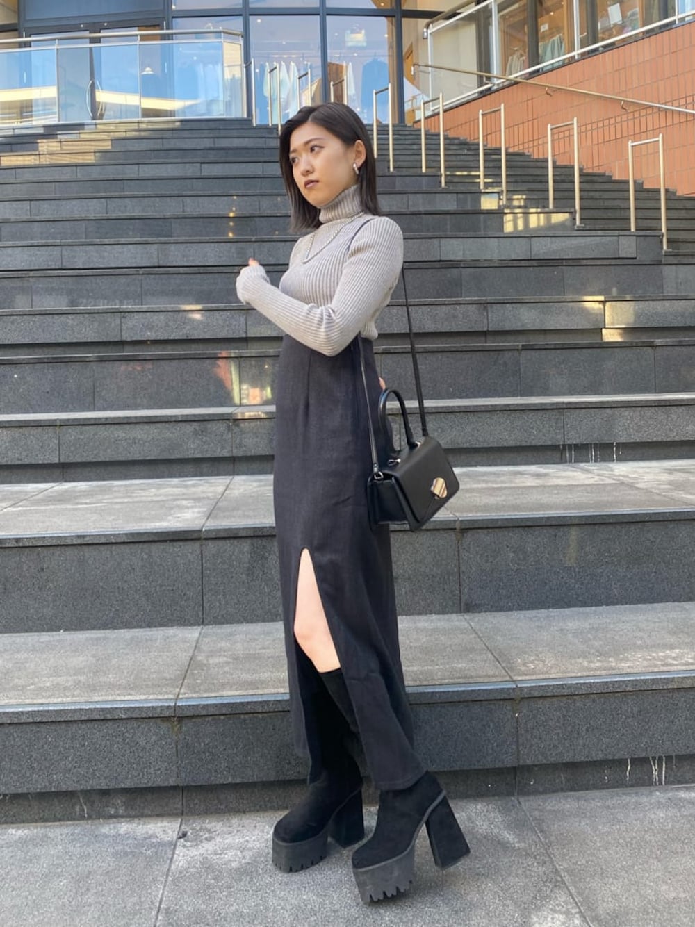 【トップス】ピタッとしたハイネックトップス。おへそより上の丈感で短めになっています!ハイウエストで合わせたときに、少しお腹チラッと見える感じも可愛いです!色味は5色もあるので、2色買いもありですね! 【ボトム】スリットが深めに入ったロングスカート。柔らかい生地感なので動きやすく、ハイウエスト丈なので短いトップスと相性◎です!152cmの私が履いて足首くらいまでくる長さだったので、低身長さんは厚底合わせがバランスよく履けますよ! 【シューズ】ロングブーツ。ピタッとしたシルエットなので足を細く見せてくれます!傾斜もあまり感じないので歩きやすいですよ!女性らしいデザインなので綺麗目コーデにもおすすめです!