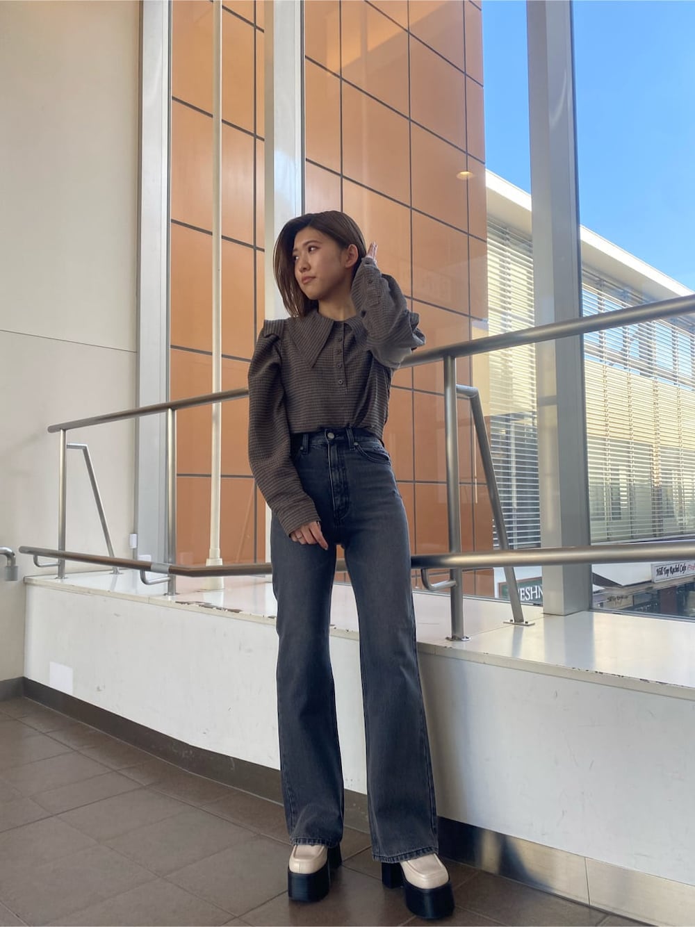 【トップス】大きめな襟がポイントのブラウスです!1枚でデザイン性もあるのでシンプルなボトムとの相性も◎です!今の時期まだ寒いので、ニットを重ねてきて、襟だけ出す着方も可愛いですし、生地はサラッとしているのでとっても着やすいですよ! 【ボトム】シンプルなジャストウエストのジーンズで合わせてみました!ウエストの位置は腰の高さまでくるので、ショートのトップスも合わせやすいです!普段トップスで暗い色や黒が多い方も、ボトムをグレーにすることで抜け感もあり、バランスよく着ていただけます! 【シューズ】23〜23.5cmでMサイズを履いています!ヒールは10.5cmソールは5cmで差もほぼ感じません!軽いのでとっても歩きやすいです! 【バッグ】マチがしっかりとあるので、収納力もあります!ショルダーバックとしても使えるので、シーンによって変えていただけるのもポイントです!!、