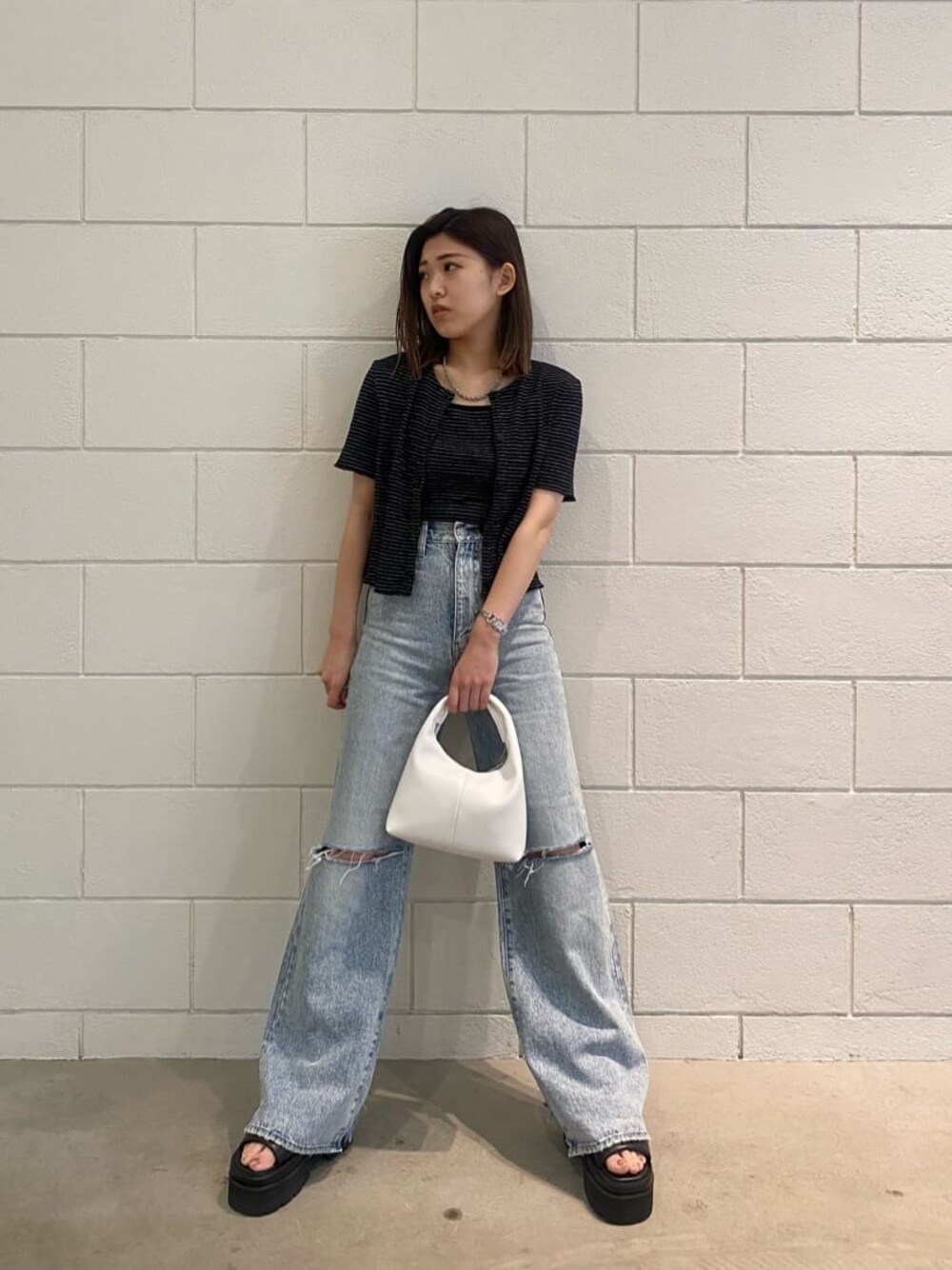 ショッピングデートコーデ 【トップス】キャミソールとカーデのSETになっているので、1つで着回し抜群です。キャミソールは丈感短めなので、お腹チラ見えも可愛いですよ! 【ボトム】太すぎないシルエットのワイドデニムは身長152cmの私でも厚底で合わせたら引き摺らないで履けました! 【シューズ】甲の部分はクッション性があるので、柔らかくて履き心地◎です!23cm〜23.5cmでMサイズ履いています!足首のマジックテープで、サイズ調節可能なのも便利です! 【バッグ】持ち手も柔らかく、コンパクトなサイズ感なのでシンプルで使いやすさもあります!