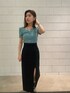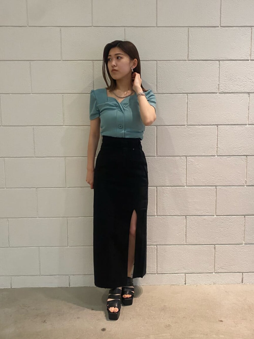 綺麗めコーデ 【トップス】スクエアネックが鎖骨ラインを綺麗に見せてくれ、フロントボタンが大きいので細見え効果もあります。柔らかい素材なのでさらっとして着やすいですよ! 【ボトム】デニム素材のロングスカートです!深めのスリットと裾の切っぱなしが可愛いデザインです!低身長でも合わせられる足首くらいの丈感でした! 【シューズ】すぽっと簡単に脱ぎ履きできるタイプです!ヒールの形がおしゃれで可愛いですよ!甲の部分は柔らかめなので、痛くなりにくいのも特徴的です!