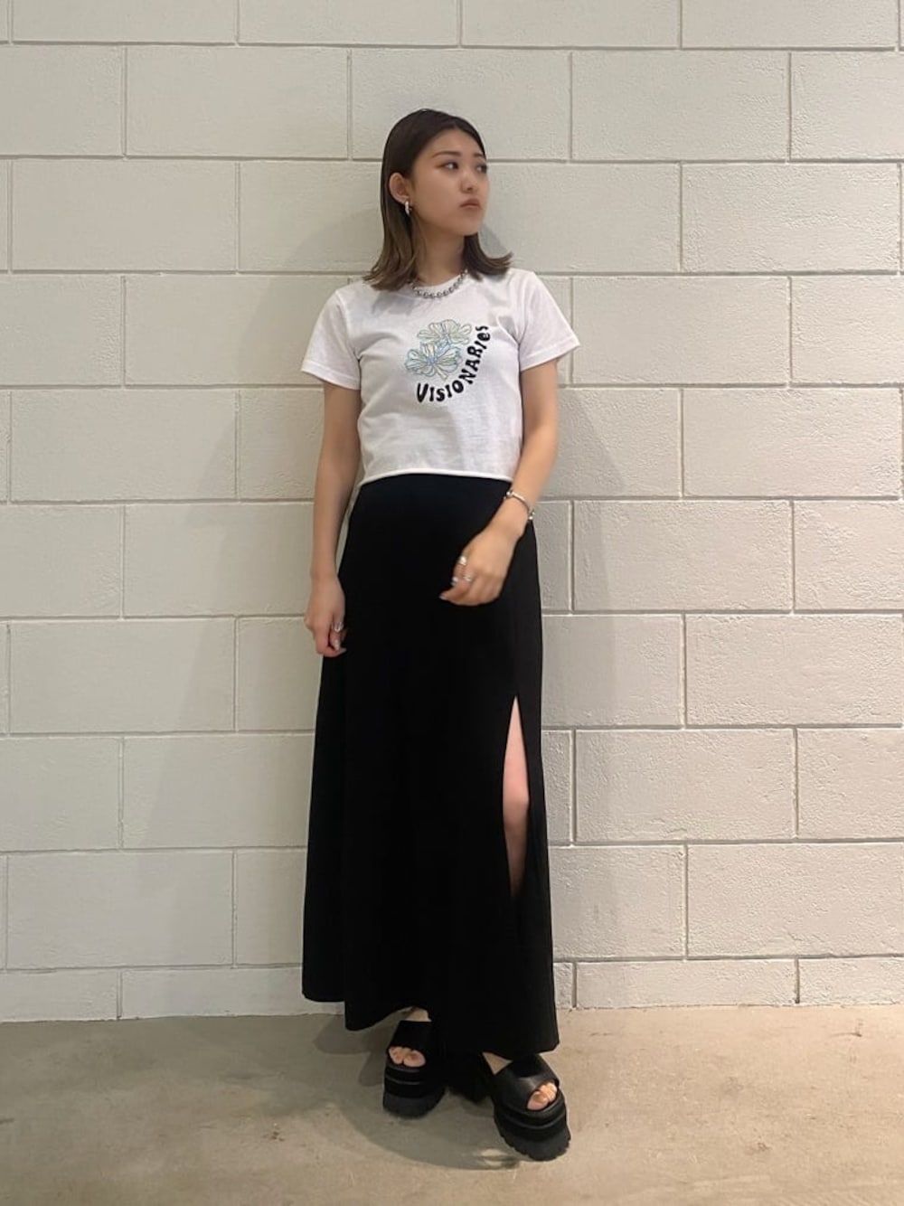 シンプルコーデ【トップス】ミニ丈でおへそ上くらいの丈感で着ていただけます。いい意味で生地の薄いTシャツなので、夏さらっときやすいです!【ボトム】もちっとした素材のスカートで、触り心地◎です!スリットも深めで大体膝上くらいからになるので、涼しいです♩カジュアルや綺麗めなど幅広く合わせやすいです。【シューズ】23cm〜23.5cmでMサイズ履いています!足首のマジックテープで、サイズ調節可能なのも便利です!【アクセサリー】大きめなデザインがインパクトもあり、コーデのポイントになりますよ!