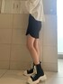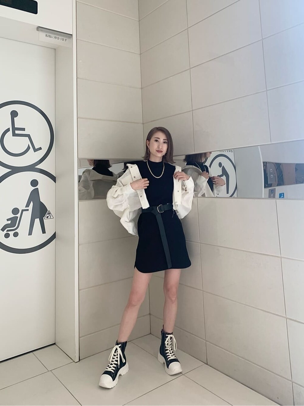こちらのジャケットは後ろが若干長めで、前はショート丈だから脚長効果に繋がります。分厚すぎない生地なので、これからの梅雨で少し肌寒いときに温度調整しやすいです。ワンピースはいつもより少し長めなので、高身長の方でも安心して着用頂けるミニワンピ丈になります。スニーカーはインソールが入っているので、しっかり脚長効果があります。クッションがあるので、とても歩きやすいです。