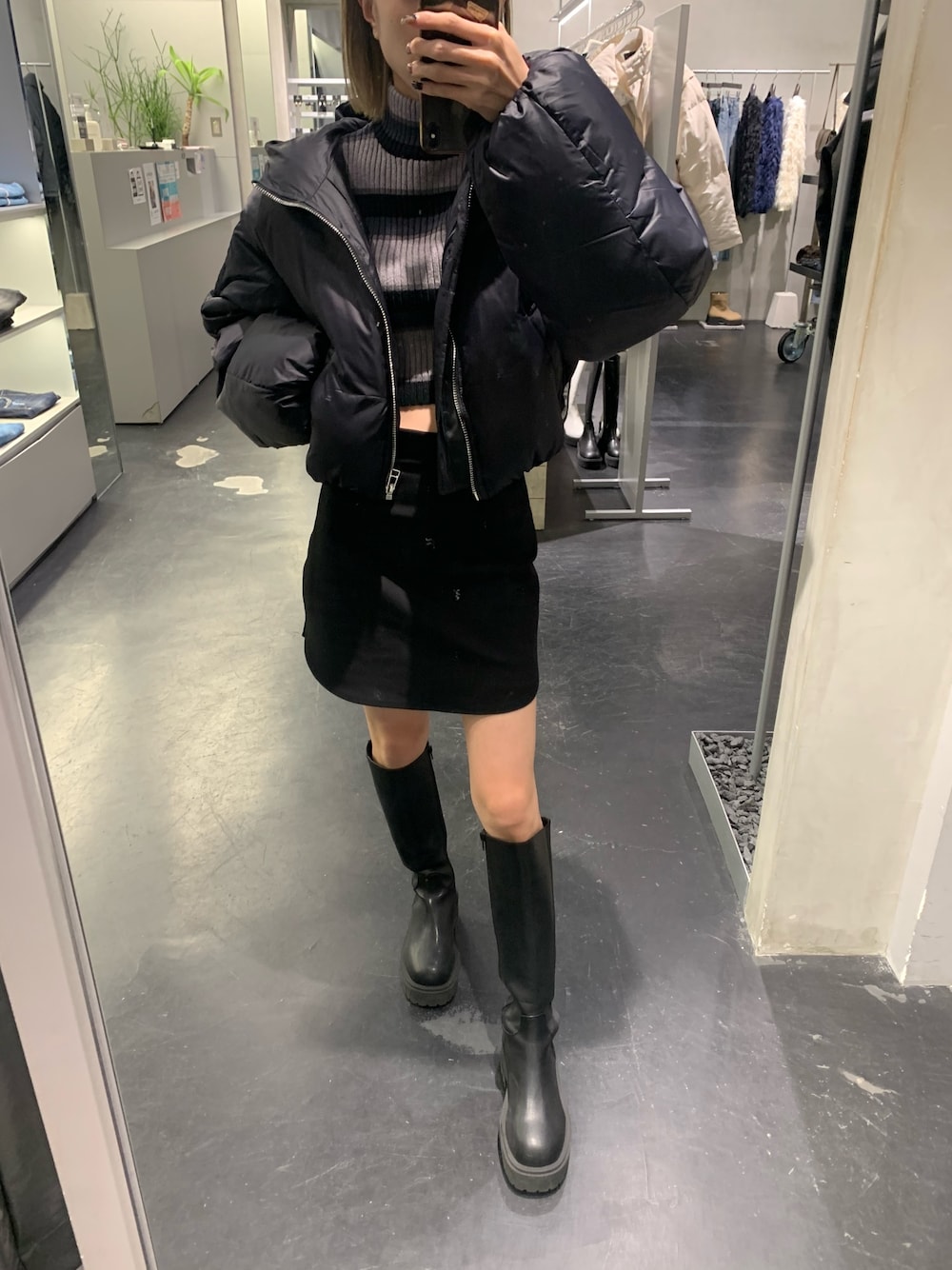【トップス】 クロップド丈のハイネックトップです! 大人気で再入荷になりました♡ 肉厚な生地感になっております! 【アウター】 ショート丈のダウンになります 袖口がゴム入っているので、風が通らないようになってます ダウン50%フェザー50%であったかくて、軽いダウンになります! 【スカート】 フリーサイズのゴムのスカートです! インナーパンツ付きで季節問わず使いやすい生地です♪ 【ブーツ】 膝下のロングブーツです! サイドゴアになってて内側にチャックなので履きやすいです つま先は丸みがあってコーデによって印象が変わります♪