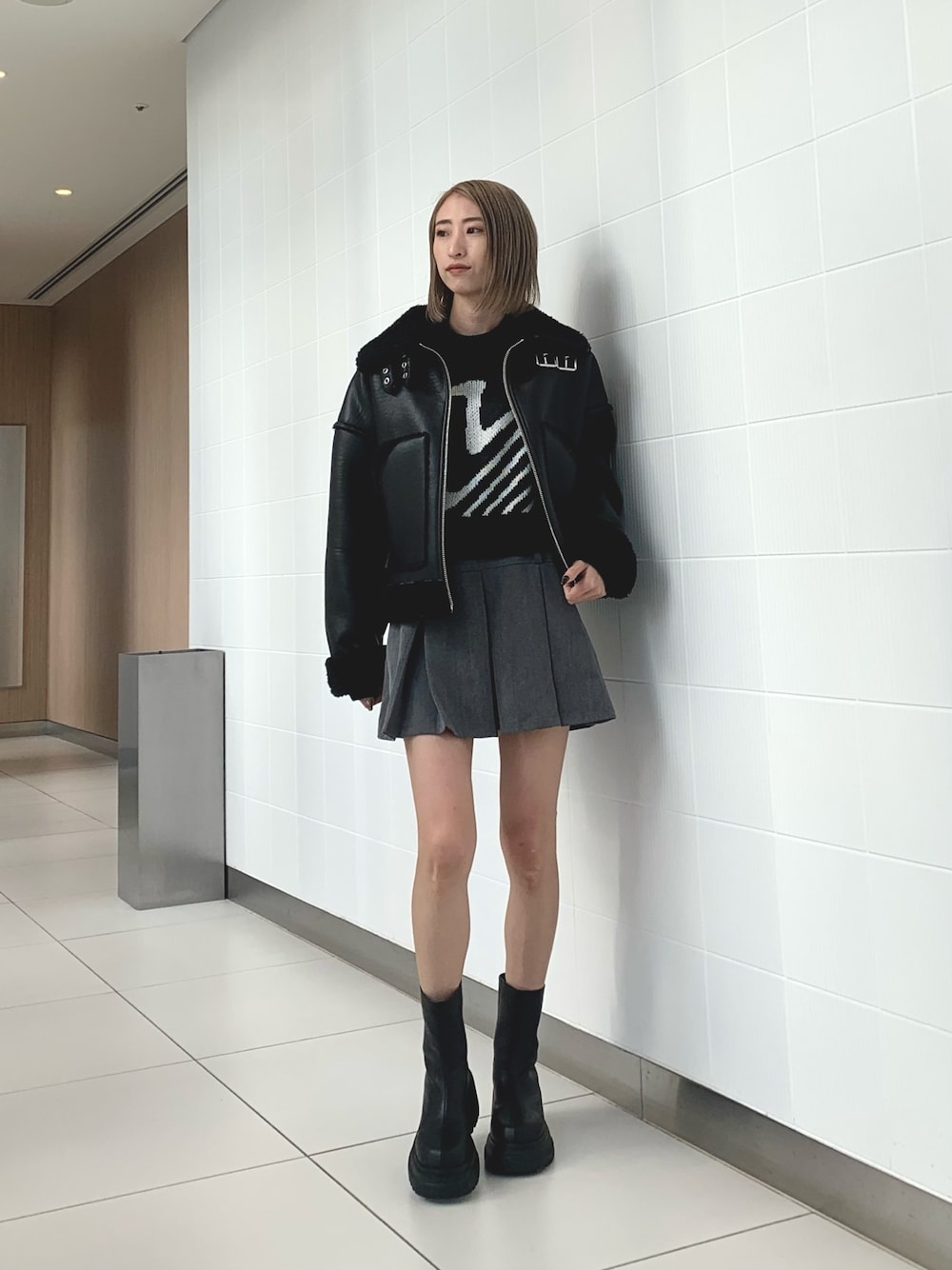 【アウター】 大人気のムートンになります♡ フェイクレザー使用で何度か着ると柔らかみがでます!中もボアがついてるので暖かいです。ショート丈で私は腰ぐらいまで隠れました! 【ニット】 ゼブラ柄のニットです♡EMODAらしい型作りで、袖はキュッとして腕周りがふんわりしているデザインです。 アップネックですが、キツくしまってはいなかったです! 【スカート】 今年大人気のプリーツスカートです。 ベルトループがハイウエストとローウエストで付いているので、Y2Kファッションにも使えます♡ 中はインナーパンツ付きで安心です♡ 【ブーツ】 後ろにジップがあるショートブーツです! 後ろ姿の足元までオシャレに決まります⭐︎ クッション性がありとても歩きやすいです!
