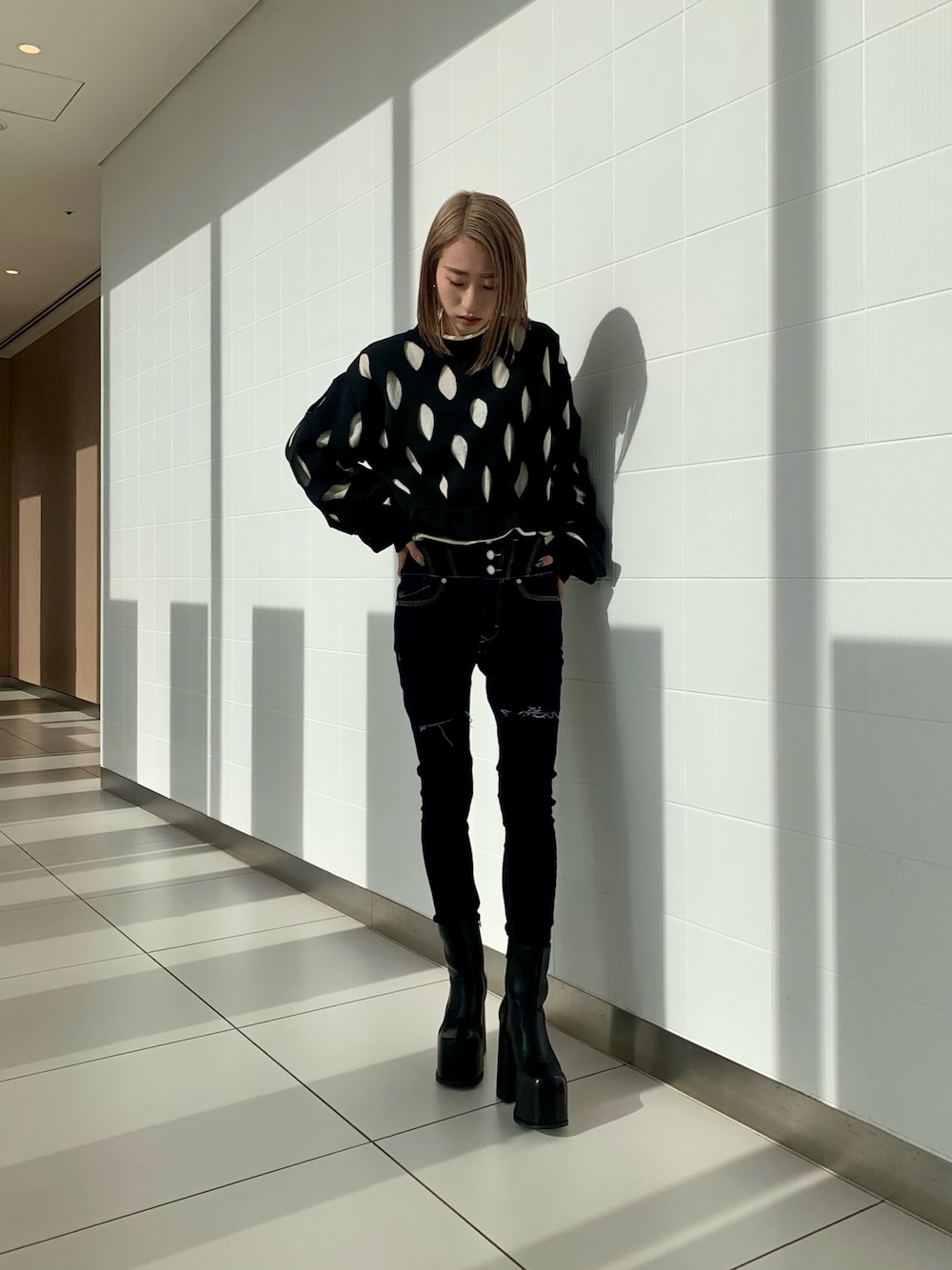【トップス】 リバーシブルで着れるニットトップスです。 デザイン性があるのでアウターを着てもアクセントになってくれます♪ リバーシブルで着るとステッチがオシャレです⭐︎ 【デニム】 太ももあたりにクラッシュが入っているデニムになります! 少しの肌見せで抜け感が出せます! ストレッチ性に優れているので、とても履きやすく、動きやすいです! 【シューズ】 現在EMODAで1番盛れて楽なシューズです♪ 少し光沢のある素材感がオールブラックのポイントになってくれます。
