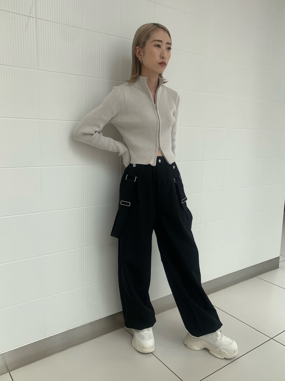 【トップス】 上下ジップになっているので、逆開にしてウエストの肌見せも可能です。 カラー展開が6色なので、春らしいカラーと定番カラーの2色買いがオススメです 縦リブで細見え効果があります 【パンツ】 ウエストゴムのフリーサイズになります サスペンダーは取り外し可能なので見え感を変えることができます 裾にはアジャスターで絞ることができるので、低身長の方は絞って少し上に上げてから生地を下ろすと丈の調整が出来ます 【シューズ】 シンプルなデザインですが、厚底になっているので自然に足が盛れます また軽いので歩きやすいです 替えの靴紐も付属しているので、その日の気分で変えることができます
