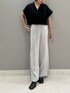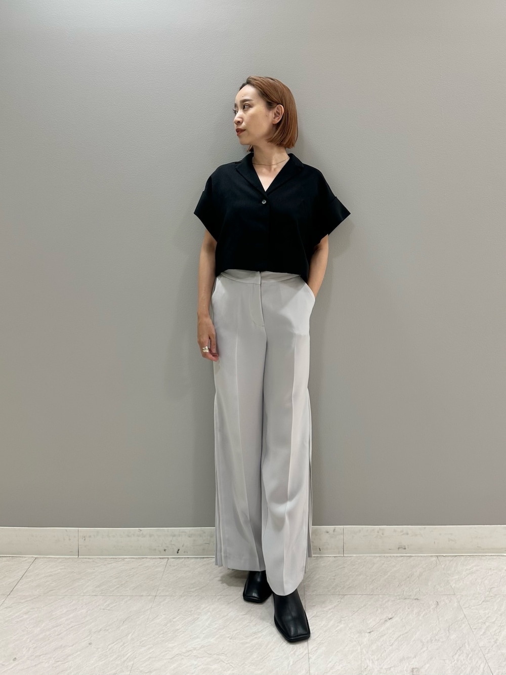 履くだけで綺麗に脚長に見せてくれるプリーツパンツ。 153cm・01サイズ着用、少し長めの丈感のためくるぶしは完全に隠れます。 動く度に綺麗に揺れるプリーツがポイントとなり、つい目を惹かれる1枚です✨️ 更にショート丈ジャケットを合わせて、低身長でもバランスよく着こなせる仕上がりに。ジャケットは袖の折り返しが二の腕カバーとなり、リアバイしたのですが早速ヘビロテアイテムです🫧これから肌寒くなってきたら、インナーにハイネックなどを着て愛用したいと思います🧶