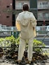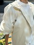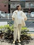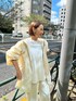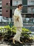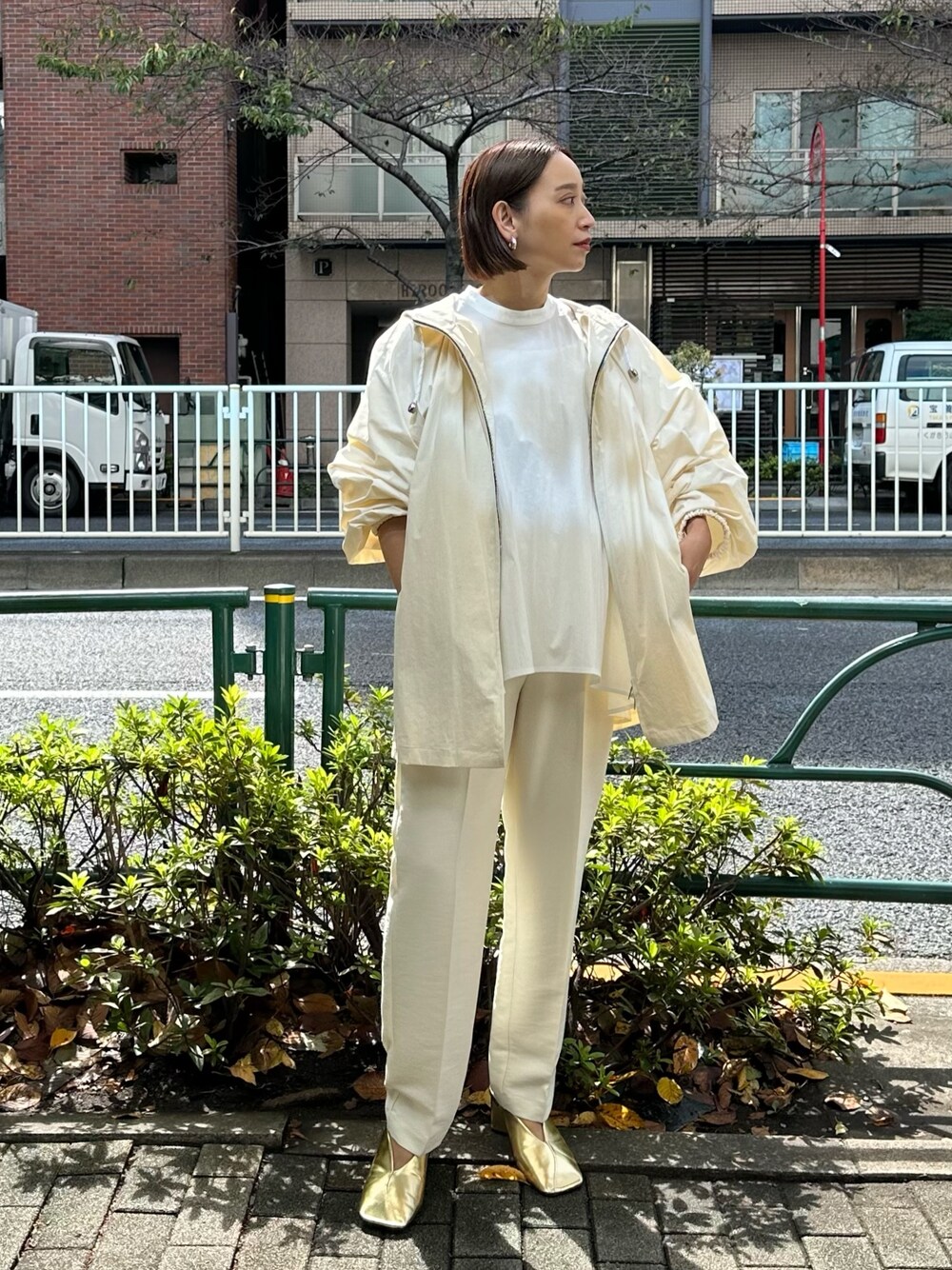 【アウター】軽いナイロン生地のフーディーブルゾンは、春や季節の変わり目に羽織りたいアウター。胸元にはギャザーが寄っていて、カジュアルすぎずにエレガントに着られます🌼153cm/フリーサイズでヒップラインが隠れる着丈です。 【トップス】ピンタックのボリューム袖がポイントのブラウス。袖口はスッキリとしているのでモードな大人フェミニンな雰囲気に。Aラインのフレアシルエット×後ろの丈が長いのでお腹周りもカバー◎ 背面に引手テープファスナー付きで、バックスタイルも完璧✨️ 【ボトムス】同素材ジャケットとセットアップ可能なワイドパンツ。レイヤードしているかのようなダブルウエスト仕様に。裾をしぼったコクーンシルエットが特徴的なパンツです。サンプルのため02サイズ着用していますが、長め丈なので150cm台の方でしたら01サイズがオススメ。 【シューズ】中敷き・甲に当たる部分がふかふかで痛くなりにくくなっています。ウェーブのカッティングが取り入れるだけでオシャレ見え。