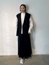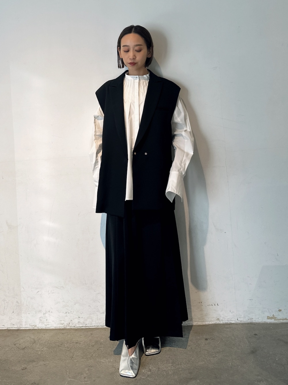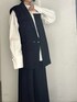 【アウター】オーバーサイズのジレには肩部分に薄手のパッド入り。着るだけでマニッシュな雰囲気になります。ポケットにはメタルジップがあり、ボタンは表に見えないドットボタンが拘りポイント。同素材のボトムスとセットアップがオススメ。 【トップス】ハリ感のあるしっかりとしたコットンナイロン素材のブラウス。胸元に細かくタックが入っているのでボリューム感が抑えられスッキリ。袖口にはメタルボタンが付いていて、カフスのように見えアクセントに✨️ 【ボトムス】縫製によってタックをプリーツのような見え方に仕上げています。ラップ風のデザインですが、脚は見えない作りなので心配無く履けます。 【シューズ】中敷き・甲に当たる部分がふかふかで痛くなりにくくなっています。ウェーブのカッティングが取り入れるだけでオシャレ見え。