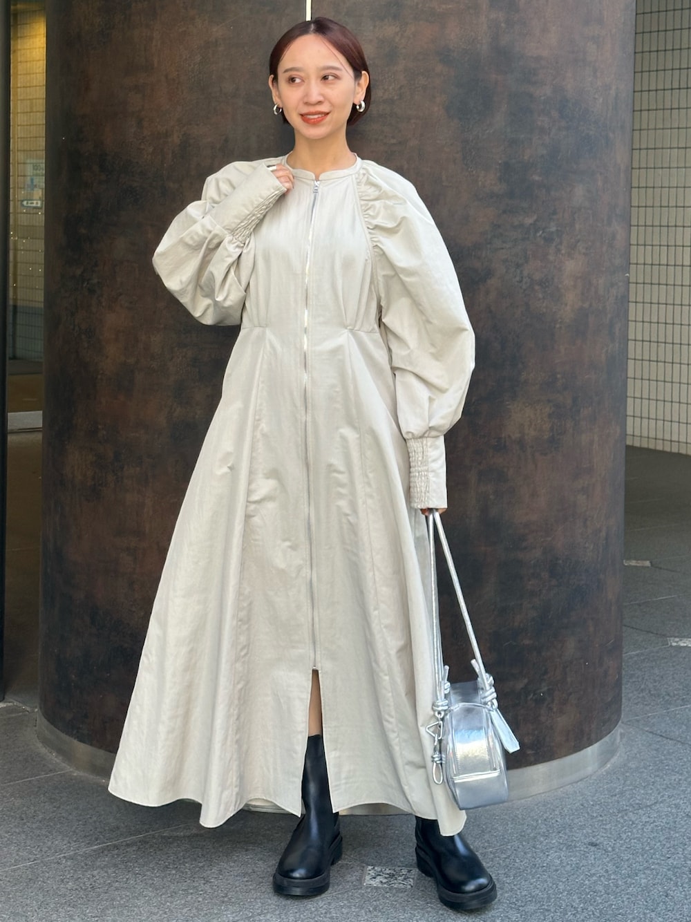 【ワンピース】✔名古屋限定カラー:ベージュ センタージップのワンピースは着脱も楽にできて着心地も軽い1枚✨お袖のボリューム感が可愛いポイント。袖口にゴムが入っているので捲った時にもふんわり感が出るのとずり落ちてきません。 02サイズで完全にくるぶしが隠れる着丈。前足首が見えるようなデザインなので、重く見えずに着られます👏 【バッグ】 500mlペットボトル・お財布・小物入れが入るくらいの容量。持ち手が長めなので肩にかけやすいです◎鍵を付けられるクロシェット、カラビナが付いているので好きなチャームを付けるのもオススメ🌟 【シューズ】 程よい厚底のサイドゴアブーツ。重くなく安定感があるので、長時間履いていても疲れにくいです✨️普段22.5-23.0cmで37サイズがぴったりでした♩