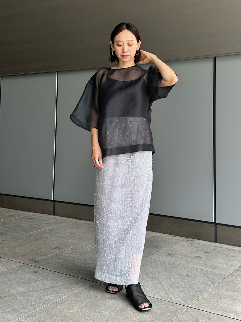 【トップス】 シアー素材のTブラウス。お袖が長め&ヒップにかかるゆったりシルエットなので取り入れやすい一枚です✨️ワンピースとのレイヤードもおすすめです! 【ボトムス】 スパンコール刺繍のチュールにプリーツをかけた素材のアイラインスカート。 ウエストは総ゴムでらくちん。ストレッチ性があって足さばきも良いです〇 02サイズ、フラットシューズでも床につかない着丈。 【シューズ】 シアー素材のフラットシューズ。つま先部分のメタルバーがポイントに💡甲を覆う部分が広く安定感があり、靴擦れしにくいです。22.5-23.0cmで37サイズがジャストでした。