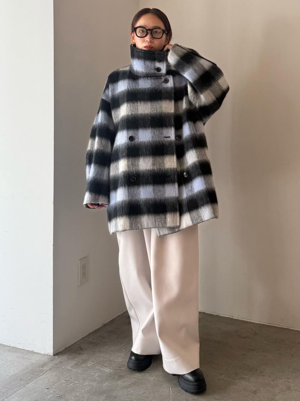 【アウター】 毛足がふわふわと柔らかいシャギーコート。軽いので肩が疲れにくく、脱いだ時に手に持っていても負担になりません✨️153cmでヒップが完全に隠れる着丈ですっぽり暖かい◎スタンドカラー・オープンカラーの2way仕様がうれしい。 【ボトムス】 コクーンシルエットのワイドパンツ。履くだけでこなれ感が出ます。サンプルのため02サイズ着用していますが、リアルに履くなら01サイズをチョイス。