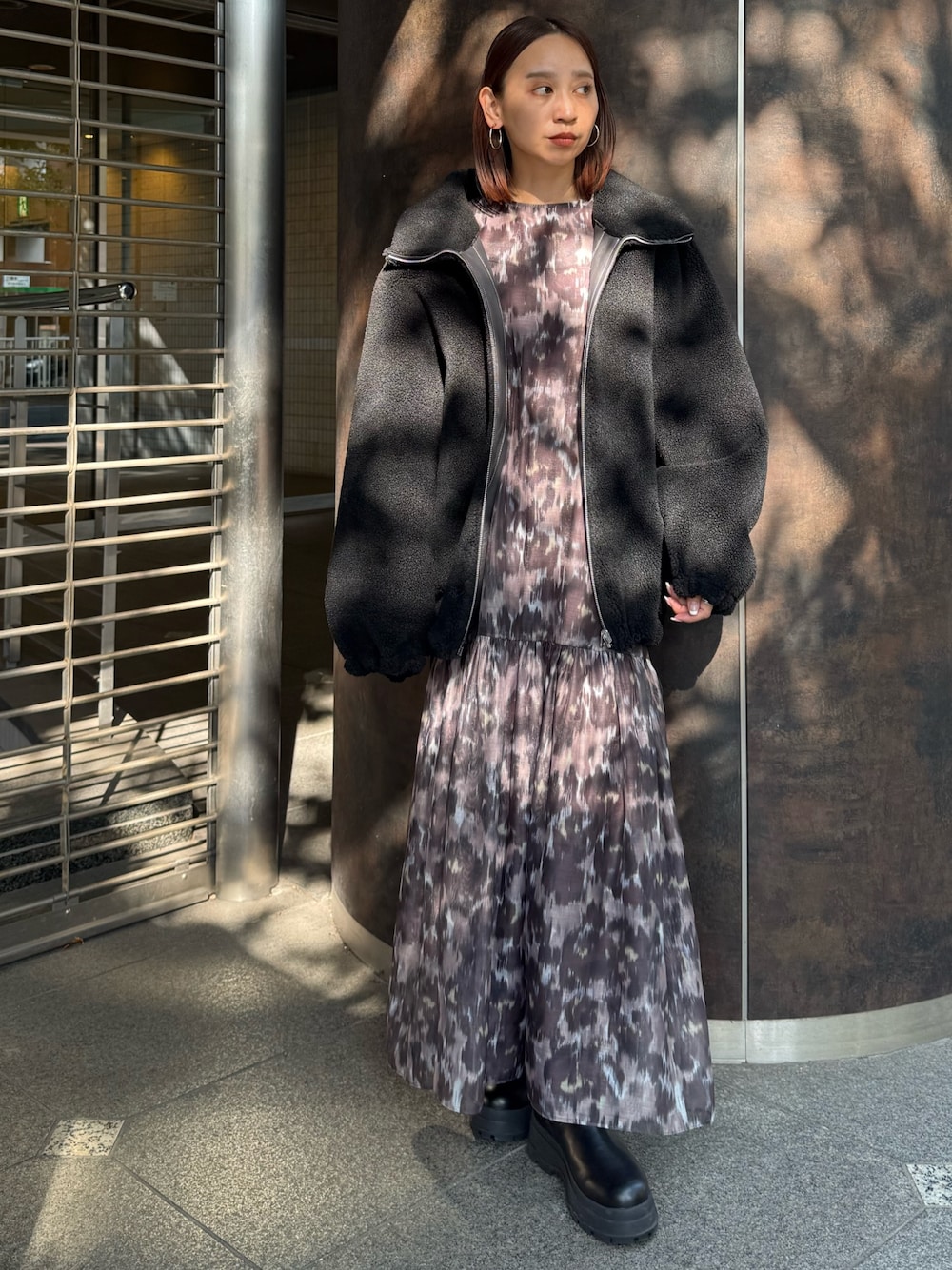【アウター】 リバーシブルのボア・フェイクレザーコート。 2way仕様なのでその時の気分、コーディネートによって使い分けが出来ます。裾にドローコードがあるので絞って丸いシルエットに変化できます。ファスナーを全部閉めるとマフラー要らずの暖かさ⛄️見た目以上に軽い着心地で肩も疲れにくいアウターです✨️ 【ワンピース】 オリジナル柄のワンピース。裏地が付いているので透ける心配がなく着られました。腕部分はほんのシアー素材になっていて抜け感が楽しめます。 長めで着たかったので02サイズを。サイドゴアブーツと合わせても床につかない着丈。