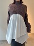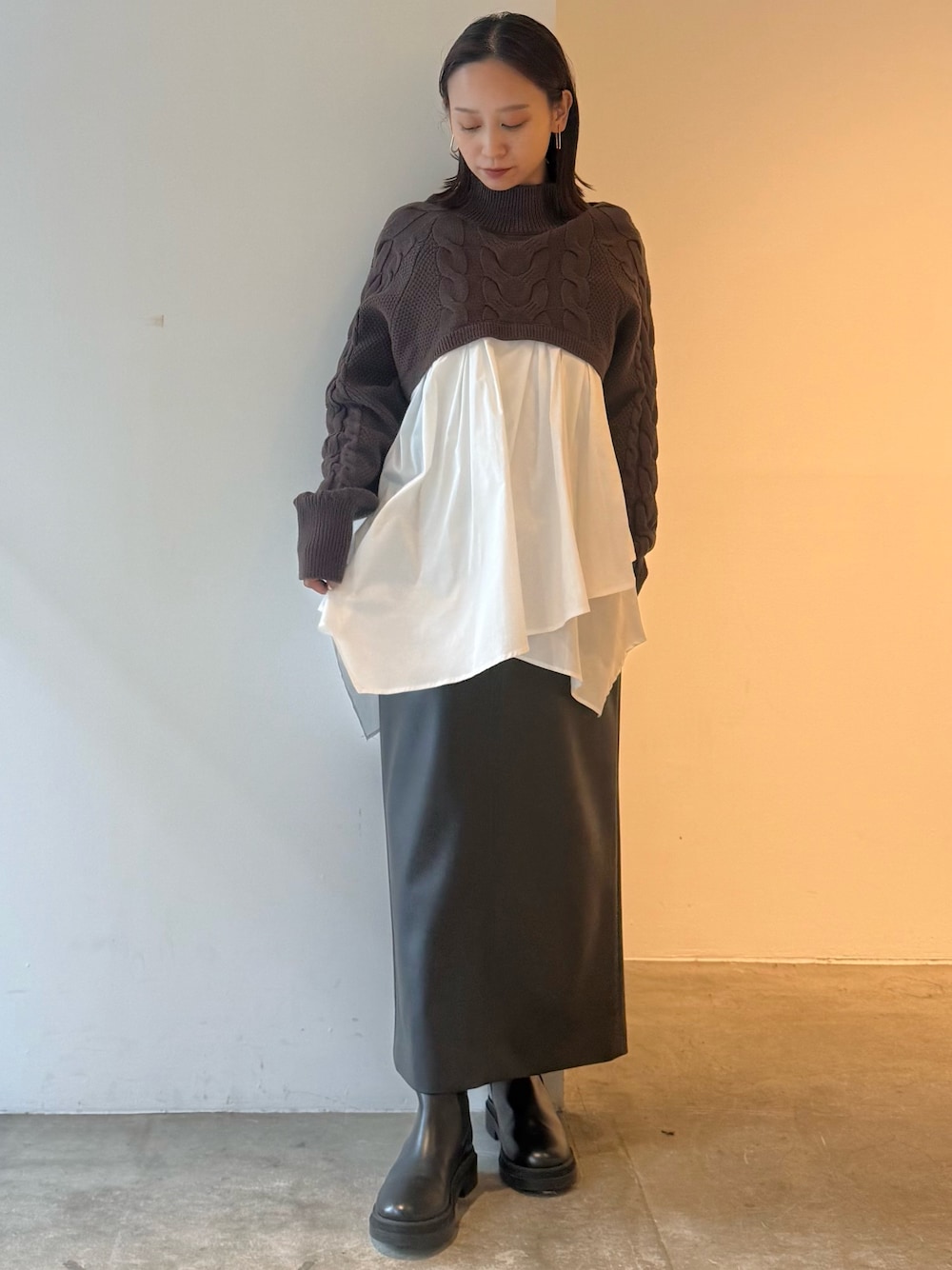 【トップス】 ニットとブラウスがドッキングされているので着るだけでおしゃれ感がでます◎ハイネックでマフラーいらずの暖かさ。アシンメトリーで長めの安心丈。 【ボトムス】 柔らかく肌なじみの良いフェイクレザースカート。Iラインシルエットで足を長く綺麗に見せてくれます。02サイズでくるぶしが完全に隠れる着丈。ウエスト後ろはゴムなので楽に履けます✨️