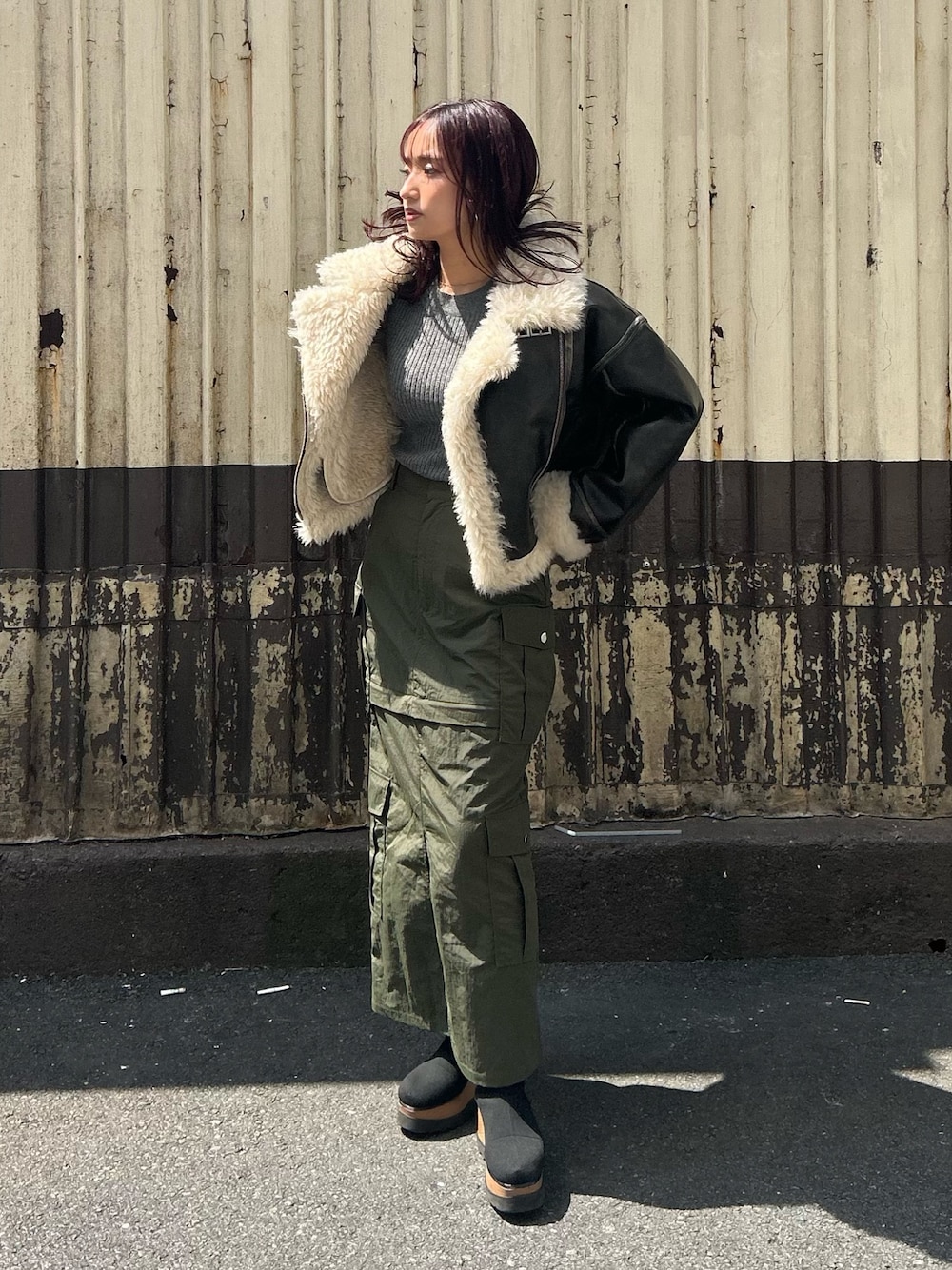 【outer】今季イチオシのムートン⭐︎ 今回はフェイクレザー仕様+毛足の長いファーで、シンプルなスタイリングにオンするだけでも存在感がありキマります♡ MURUAらしく綺麗めにもカジュアルにも対応!生地もしっかりしているので長年着用いただけますよ♡ 【tops】春夏はインナーのニットタンクのみ、寒い時期はレイヤードで着れる2way仕様! 肩をゆるく落として肌見せすれば抜けが出て、女性らしく見せられるローゲージニットです♡ 【skirt】ミニ丈にもロング丈にもできる、トレンドのカーゴスカート! デザイン自体はカジュアルですが、ロング丈にしてもバックスタイルが綺麗に見えるシルエットがお気に入り♡ これからの時期はオーバーサイズのスウェットやパーカーと合わせても可愛いです♡ 【shoes】MURUA定番のソックブーツが今年も登場! 濃い色のボトムを持ってきても、ウッド調のソールが抜けを出してくれるのがポイント♡ 足と一体化する履き心地◎ 高級感も◎