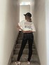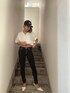 【トップス】シースルーの文字が特徴的で、ロゴの部分だけ肌見せをしているという、GYDAらしいTシャツが登場です❤︎前側はVネックデザインなので、お顔周りをスッキリ見せる効果とデコルテが見えて女性らしい印象にり、シンプルなので合わせやすさもある素敵なアイテムです!サイズ感は大きめなのと、サイドにスリットが入っているのでパンツインにしてもシルエットがかなりきれいです。今回はモノトーンカラーでコーデを組みました!ワンウォッシュスキニーパンツとミュールを合わせてカジュアルになりすぎないようにしてみました。デニムとの相性も抜群なので一枚持っていたら重宝すると思います❤︎
