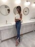 トップスはテレコ素材なので凹凸感ある素材感が特徴的で、伸縮性が高くフィット感にも優れています!自分の身体に合ったサイズ感で着用できるのでとても着心地がいいです❤︎ パンツは裾のフリンジと斜めに入ったスリットがデザインポイントのデニムで歩くたびに動きが出るのでシルエットがとてもきれいです❤︎ 今回はシンプルにコーデを組んでみましたがシャツを羽織ってもお洒落に着こなせて可愛いです!